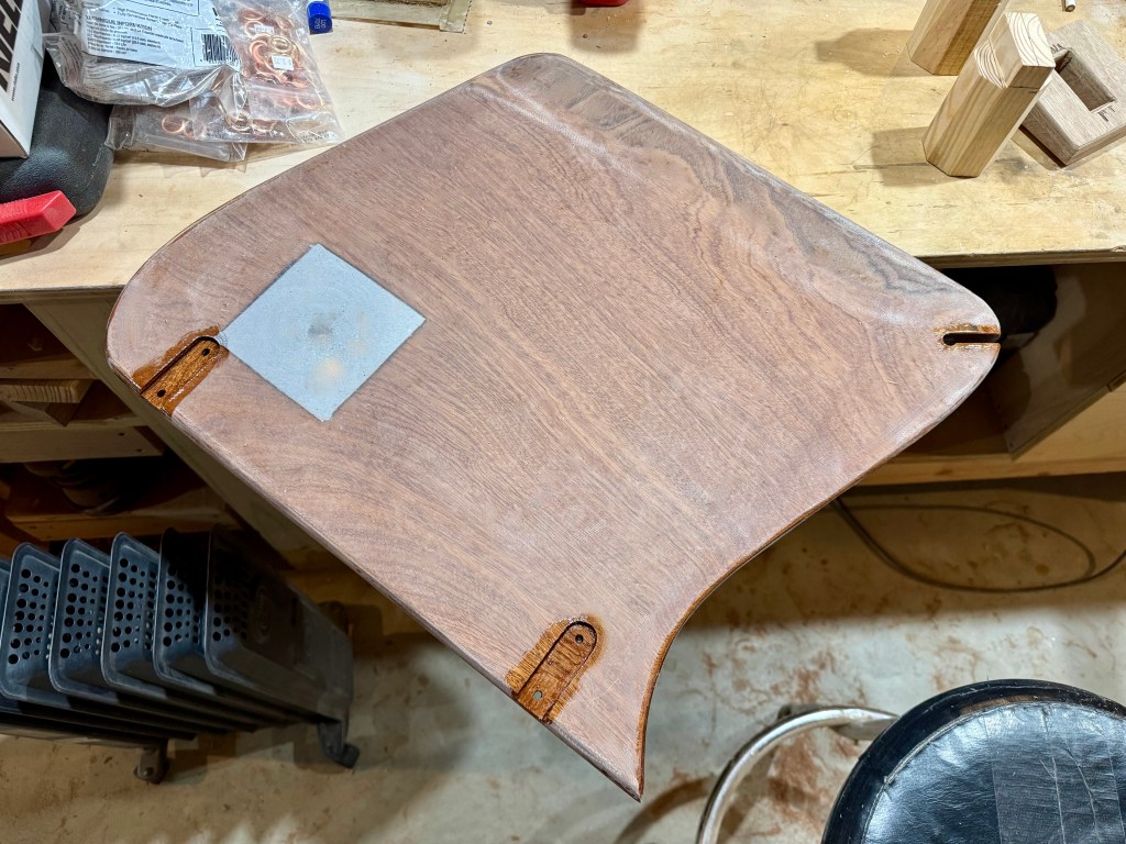 The centerboard and rudder were scaled from the drawings. Making the centerboard first would allow me to build the centerboard case around it. The arch of the trailing edge used the pivot hole location as the anchor point. It was well marked and will be drilled when the case is built to assure proper alignment. The rudder is less precise and has some “shapely flair” which is really just eye-balling a nice shape.
