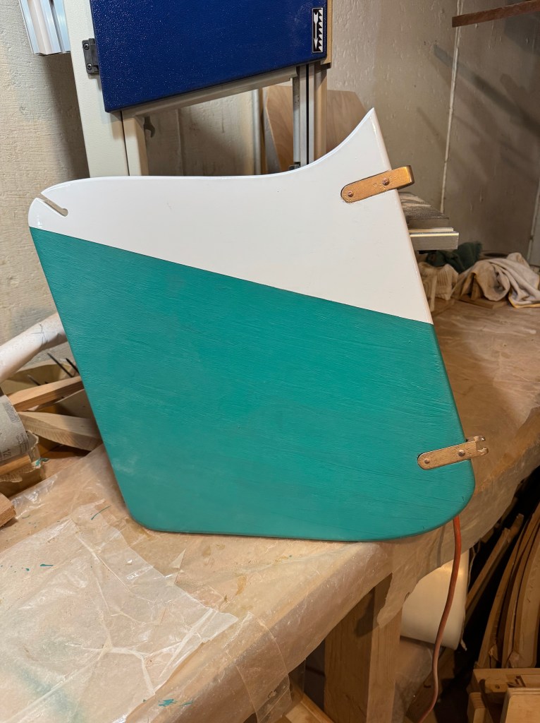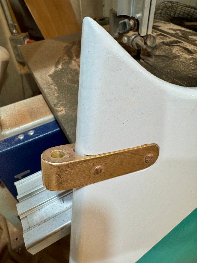 It is winter again and it is time to work in the basement – WAY too cold in the garage! I have finished the rudder and centerboard. The rudder got it’s hardware (bronze gudgeons from J.M. Reineck). They needed to be let in to be flush with the faces of the rudder. Rivets were used to secure them. A slot for the steering line was cut into the top corner. Then it got three coats of paint, bottom paint below the water line and white above.