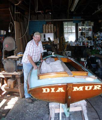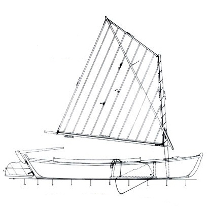 Outfitted with an unstayed mast, sprit rig with boom, centerboard, tunnel skeg, and outboard rudder, the rounded hull was quite shallow with a wide flat keel. It could be easily rowed as well as poled or sculled. Somewhat heavily built, it had an oak stem, oak keel, transom, and ribs and was carvel planked in ½” cedar. With its flat bottom, it was easily beached, drawing only about 8” with the board up. Small side decks and a rather tall cockpit coaming kept the boat dry. The boats ranged in length from 12’ to 15’-6” with a width of 4’-2” to 4’-6” and carried about 65 sq. ft. of sail.