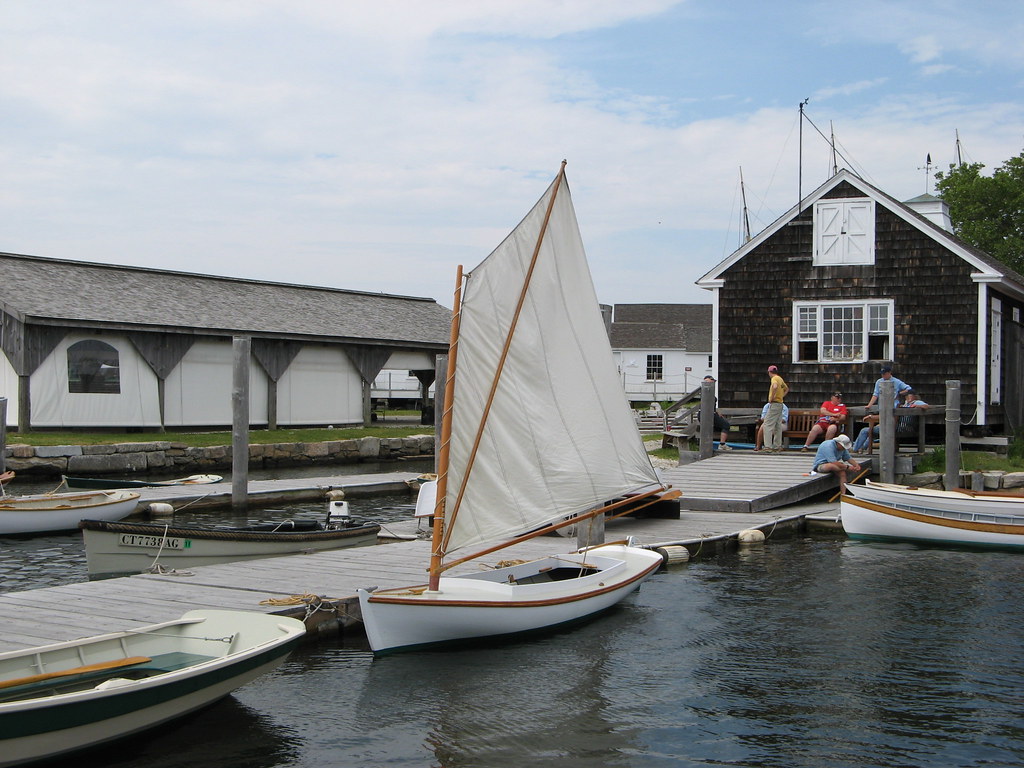 The Seaford Skiff was developed in the 1870s to sail the shallow marshes of South Oyster Bay around Seaford, Long Island. Originally used as a gunning skiff for waterfowl, clamming, and fishing by local baymen, it was sailed in both summer and winter. Later evolutions adjusted the rig for recreational use. Narrasketuck Y.C. currently has 9 of these. 5 or 6 can be spotted on the line at most any regatta in the Spring or Fall.