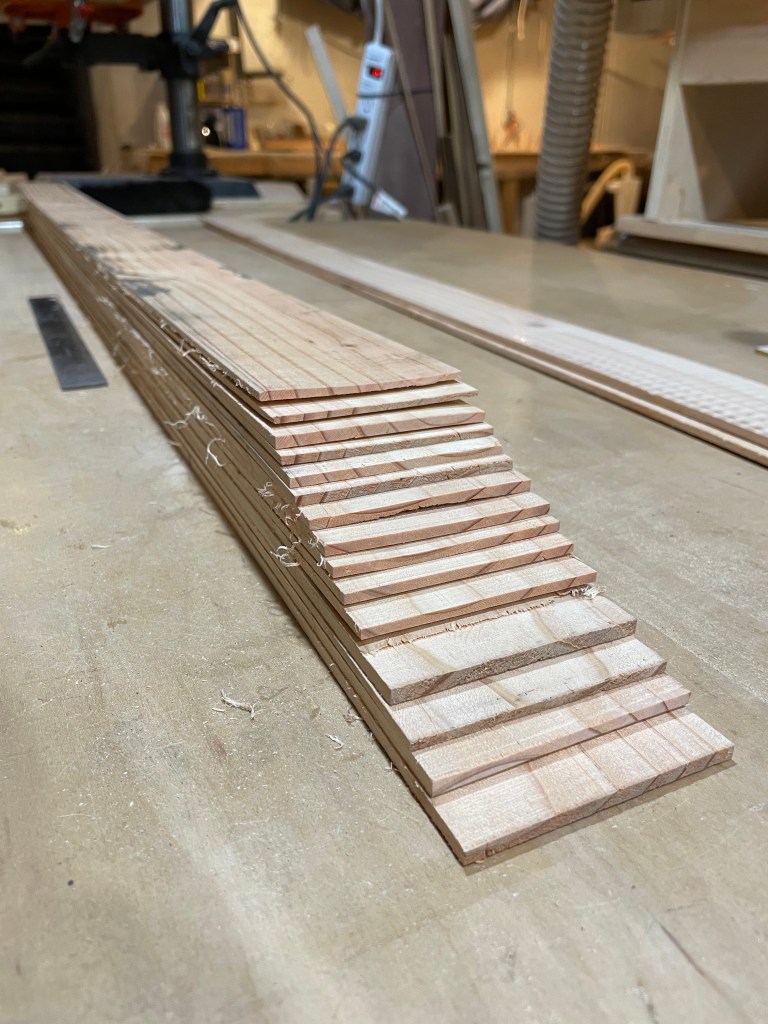 In preparation for the laminations, I cut the fir into appropriate strip thicknesses depending on the bend required. Some were as thin as 1/8″, others were up to 3/8″.