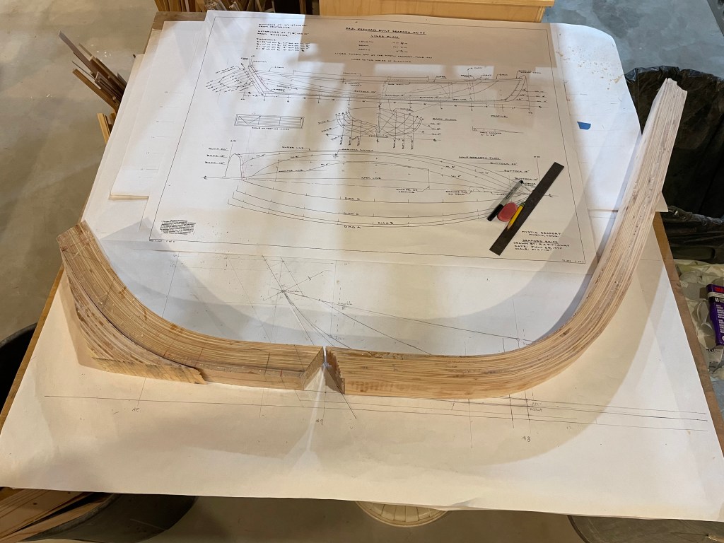 The glue ups went smoothly. There was just one breakage as I tried to use a slightly too thick lamination in a tight bend. The usual “pushing the envelope” kinda thing. The worst part of glue ups is the waiting – 24 hours for the epoxy to dry. I think most of my time building this boat was waiting for goop and paint to dry!