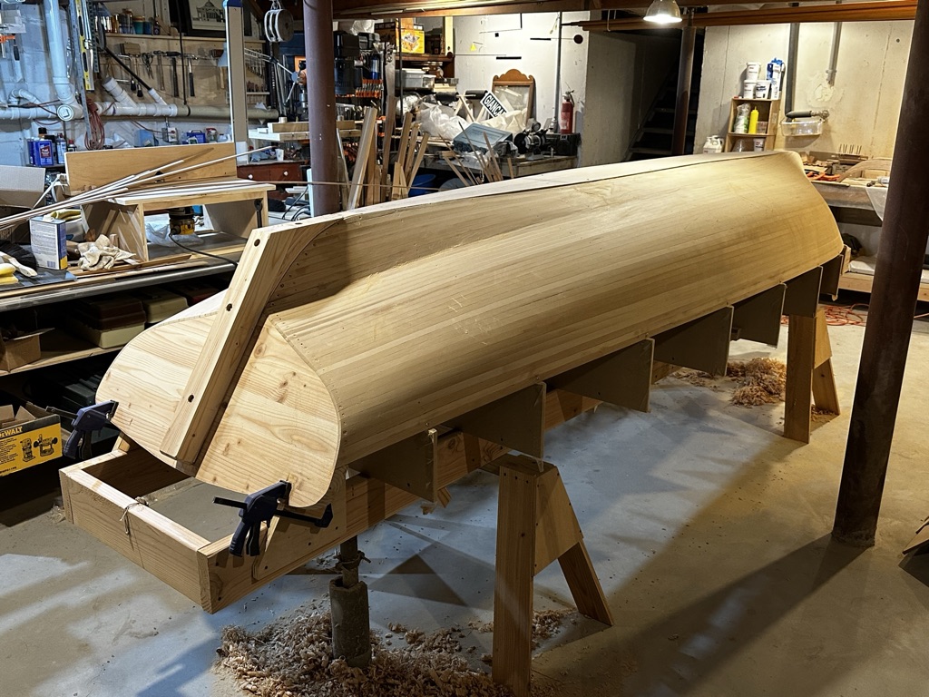 I started fairing the hull while it was still on the molds. Because the hull was made of 1/4″ cedar, retaining the molds provided necessary support until I could fair and glass it. I began with a block plane to remove the high edges from the mated bead and cove strips. Planing the cedar was very easy as it was soft, but I had to take care not to go too deep – the 1/4″ thickness concerned me throughout the fairing process. Not much to work with! From there I used diminishing grades of sandpaper with longboards made from 1/4″ ply.