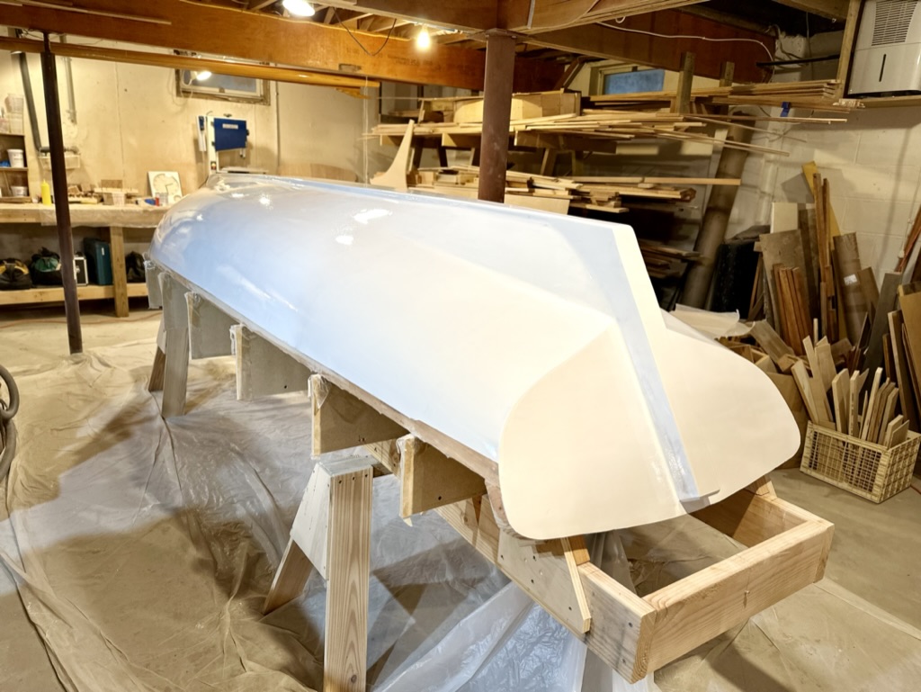 Then it was just a matter of glassing and adding the layers of covering epoxy. Still concerned about that 1/4″ hull thickness (now reduced by a 16th of an inch or more in spots), I applied the two layers of 6oz. cloth, fairing each layer with the longboards. Although the recesses got shallower, they were still there to a degree, so I filled and faired them and added the last coat of epoxy. AND faired that!