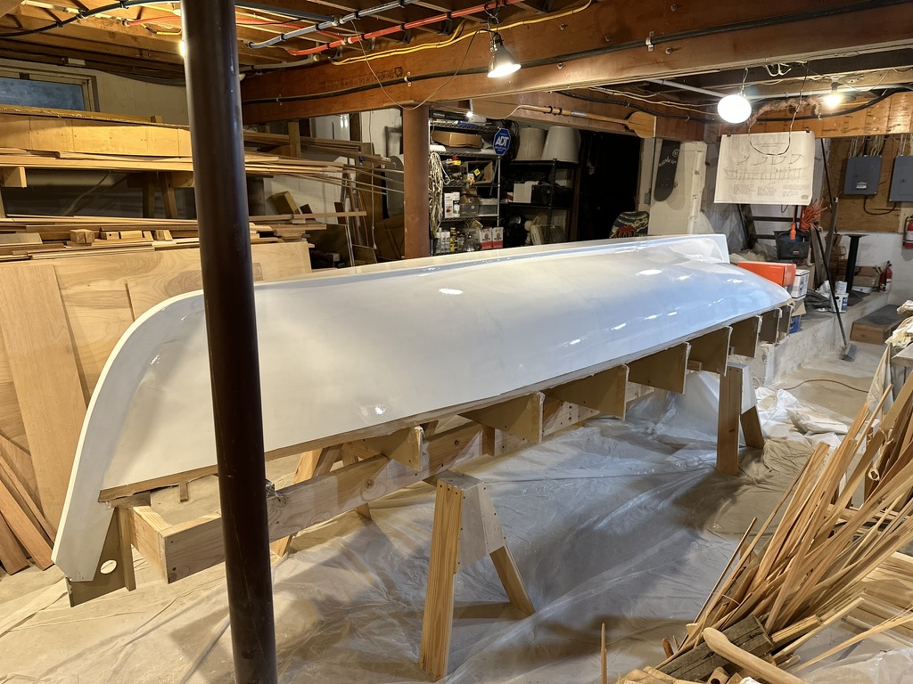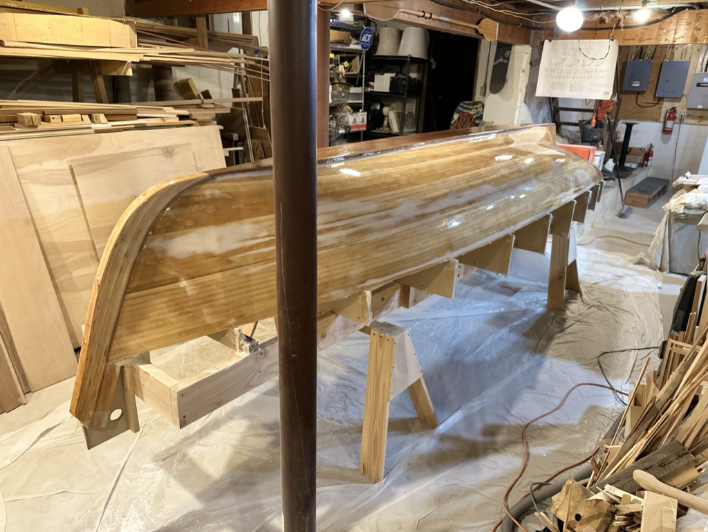 I was able to get the surface very fair. It did take a lot of sanding though, beginning with 40 grit on up to 120. As I am sure everyone who has sanded epoxy knows. “It ain’t no fun.” The substantial thickness of the epoxy allowed me to get a nice even surface, and I was feeling more confident in the strength of the hull. That 1/4″ cedar was now very stiff. After waiting a week for the epoxy to set well, I banged on the hull, sat on it, and hit it with a 2×4. No perceived deflection and no dents. Very reassuring.