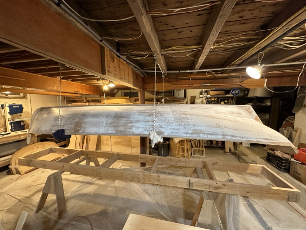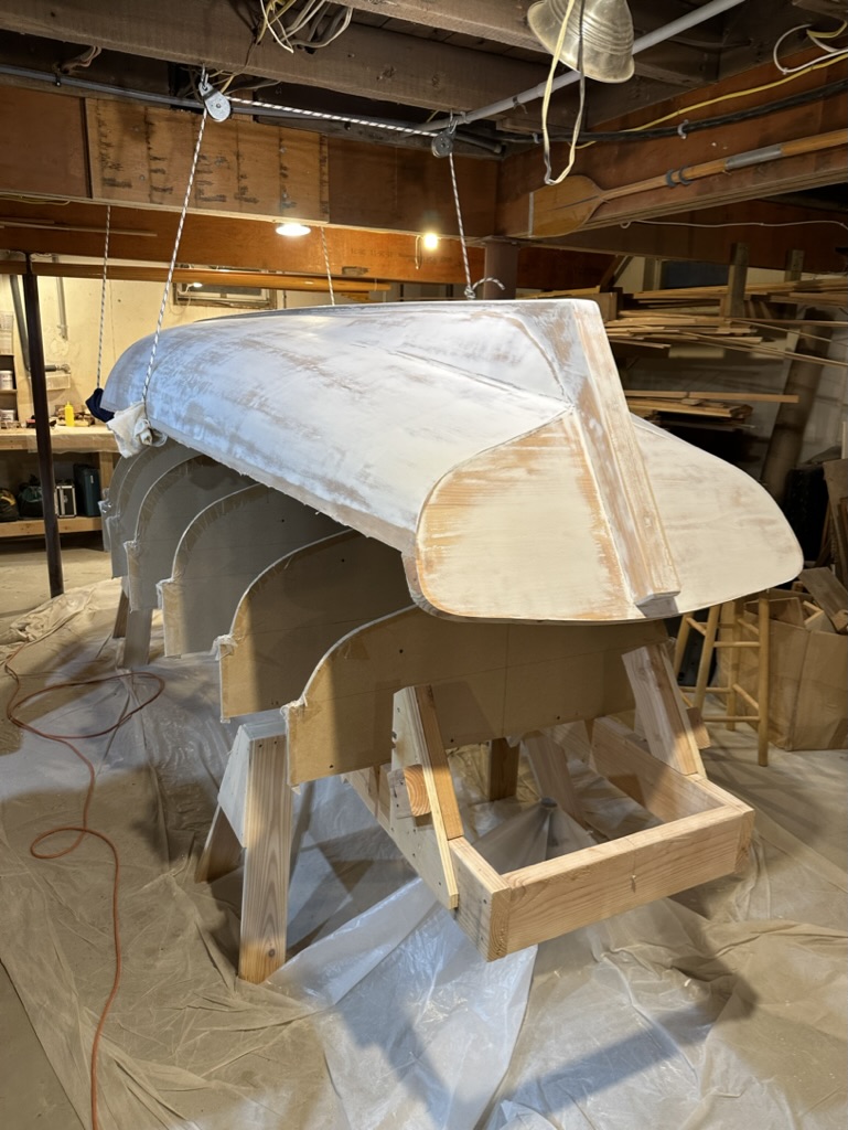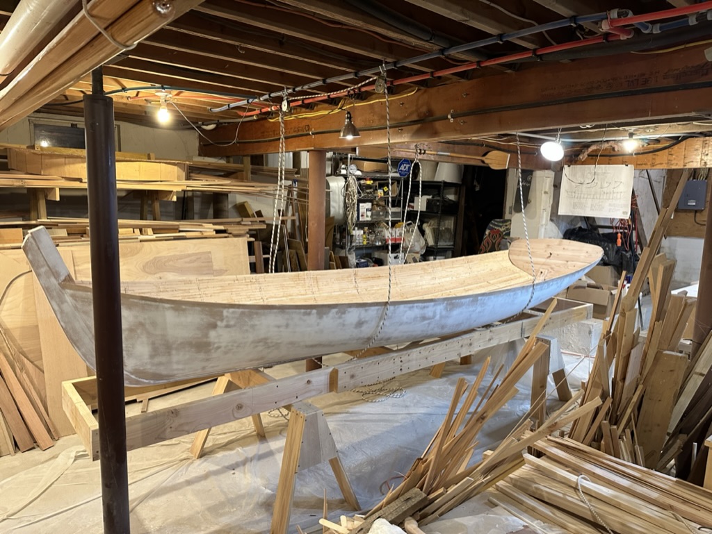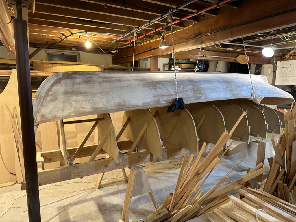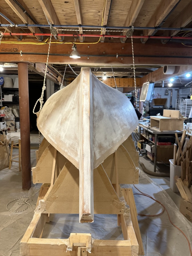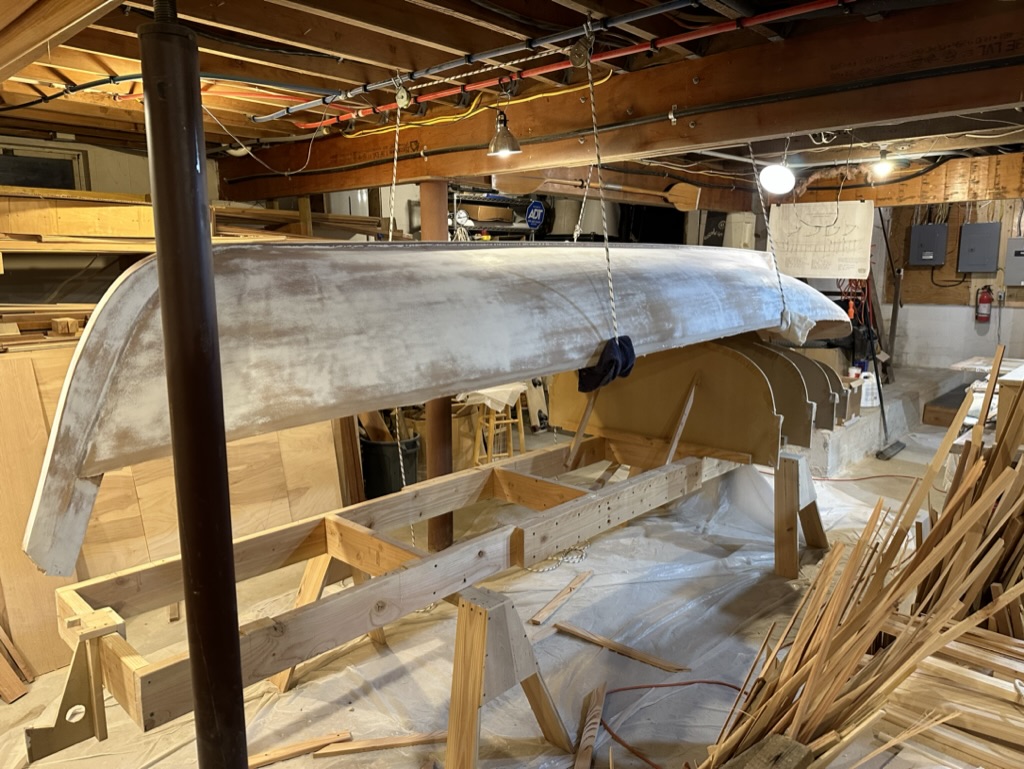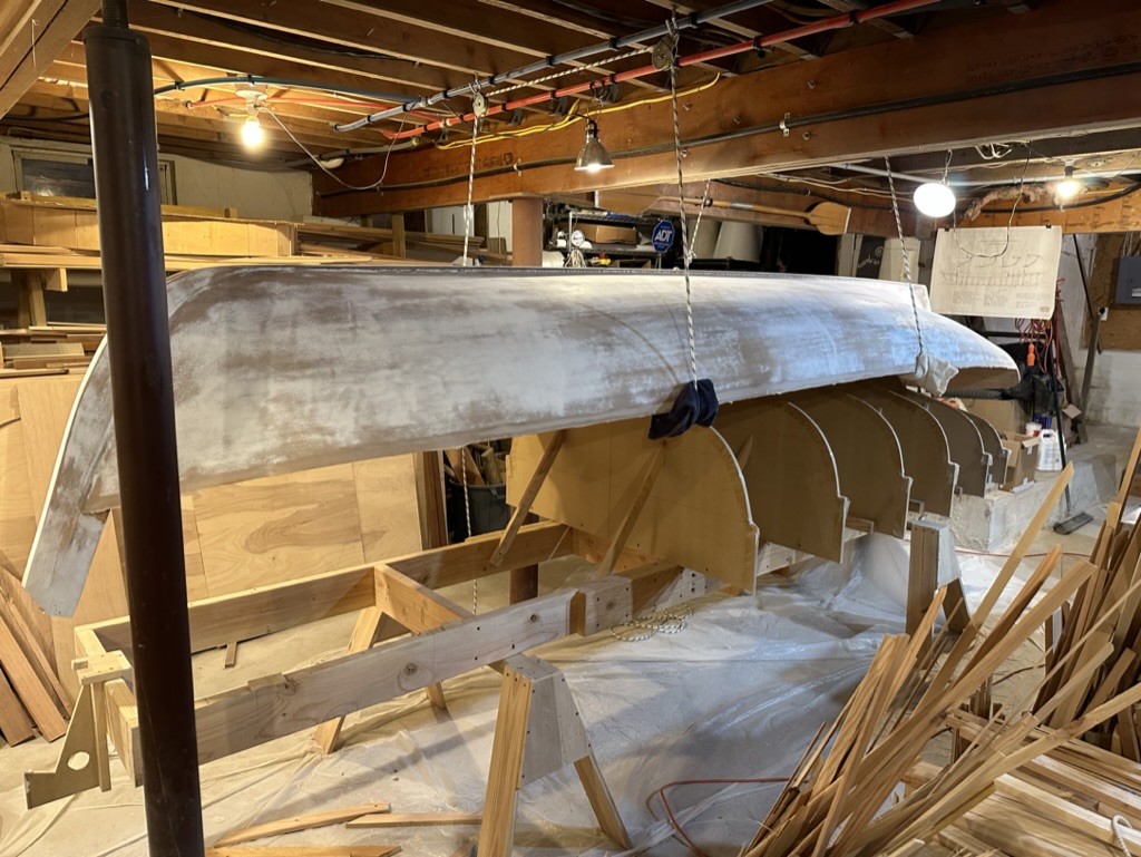Now was the time to find out if I had glued the hull to the molds! After rigging up some pulleys I slowly lifted the hull. It came off those molds without a hitch. I needed only to tap a few molds with a hammer, and off she came.