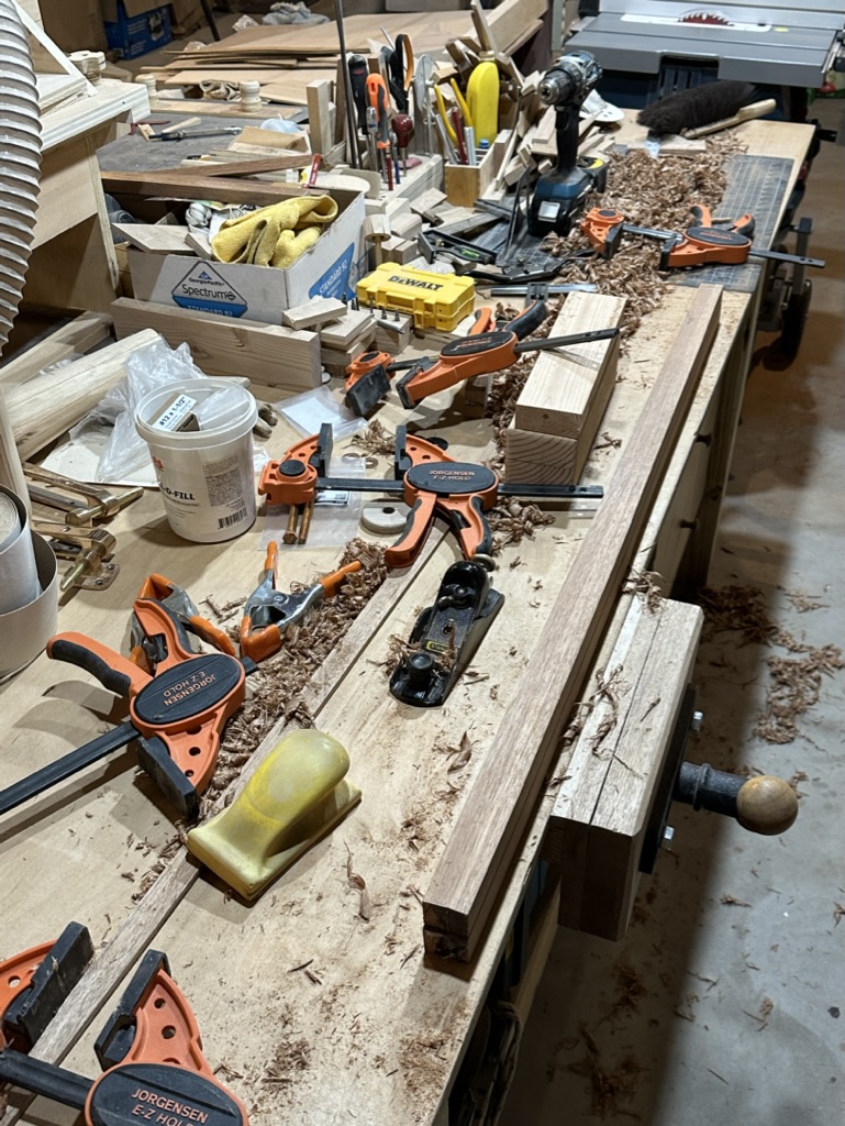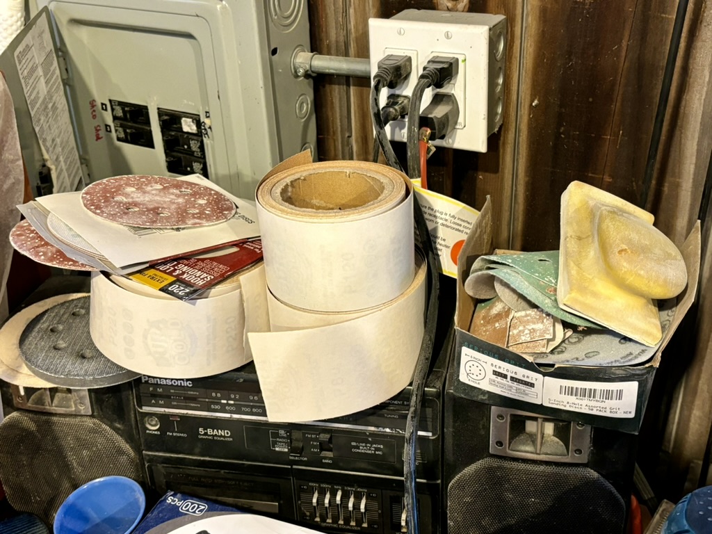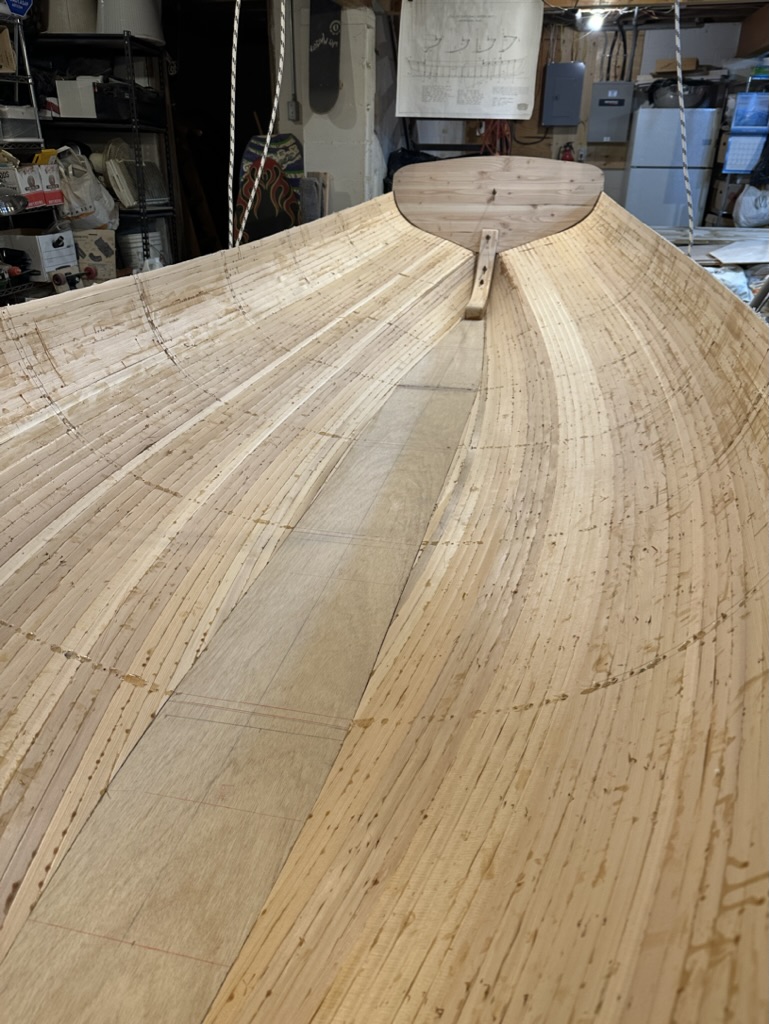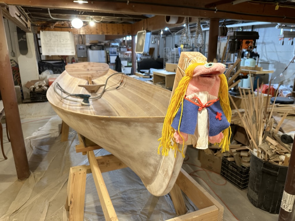 It was an easy task to sand down the interior. Much of it would be hidden below floorboards, side decks, fore deck, and stern deck. Also, concave surfaces seemed to sand more easily. Soft pads on the oscillating sander and furniture scrapers made relatively short work of that task. I also could now take some measurements to make sure the hull dimensions were correct and both sides were symmetrical. They were within a 1/8″ of each other. Remarkable!