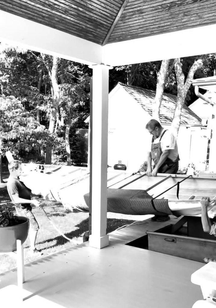 First off, the boat was quite light. On flat ground she could easily be carried by just two people. Guiding her up the stairs needed a couple more. She fit through the scuttle with a few inches to spare each side. It was awkward, but went out quickly. In the end, all my concerns about this trip were unfounded. I had visions of needing to take the scuttle structure out, cutting the boat in half, or manhandling it for hours! It went out in minutes!