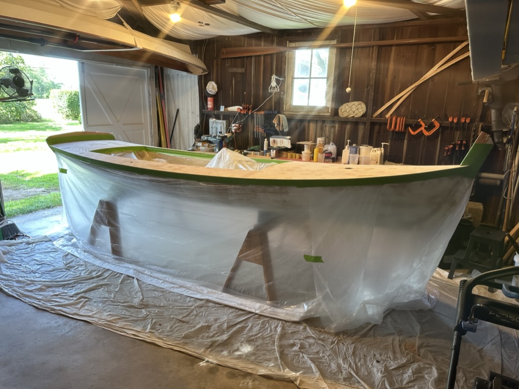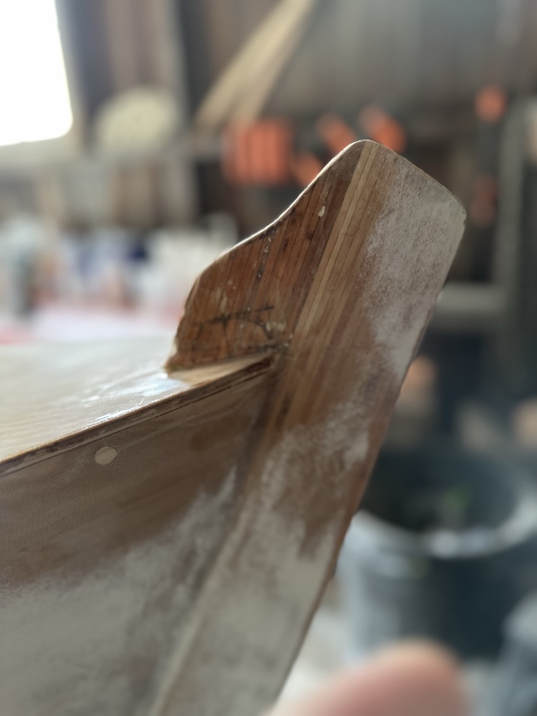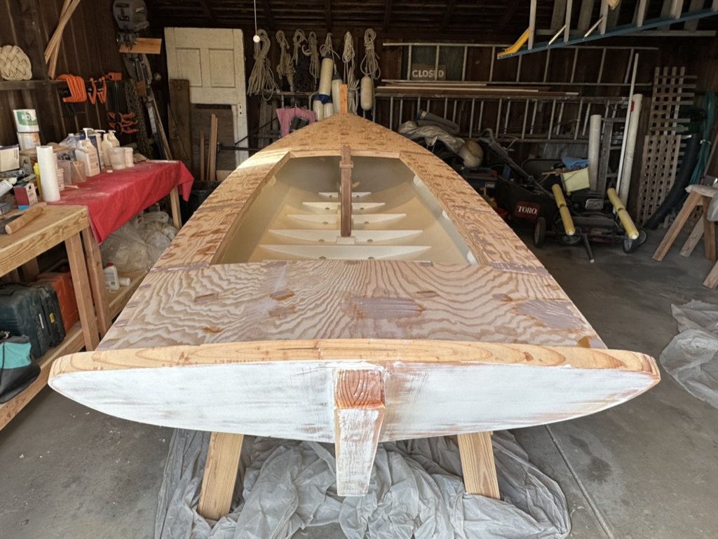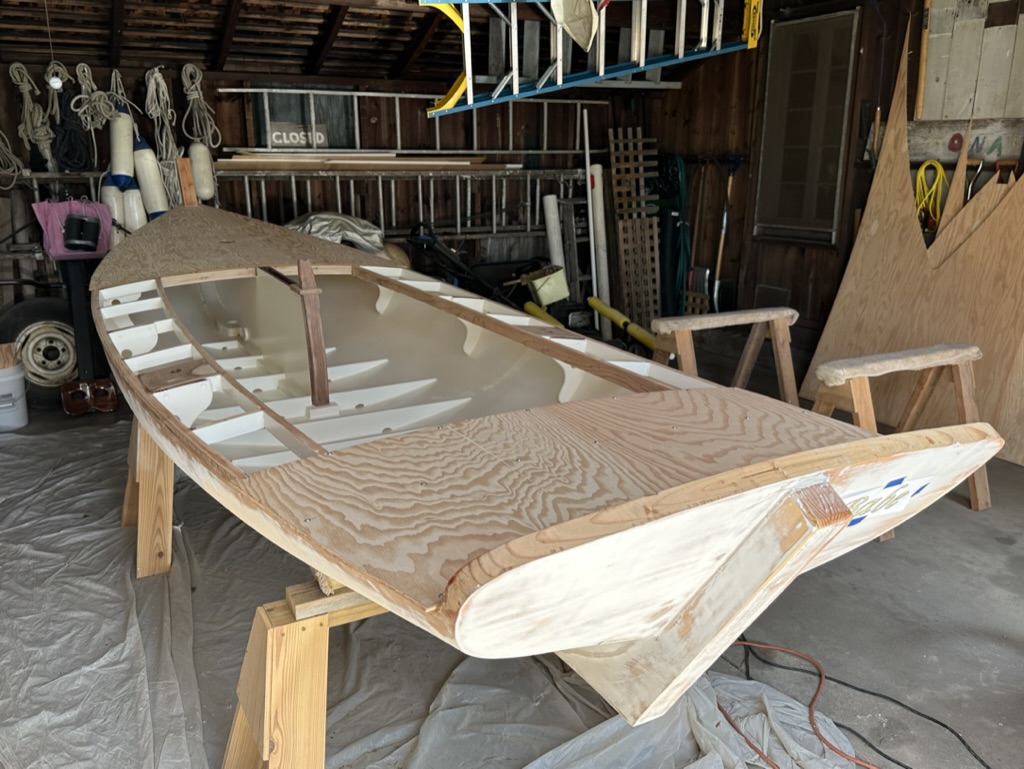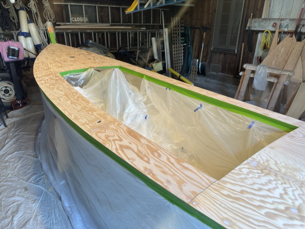 I sanded the decks smooth and laid on one layer of fiberglass cloth with three coats of unthickened epoxy.