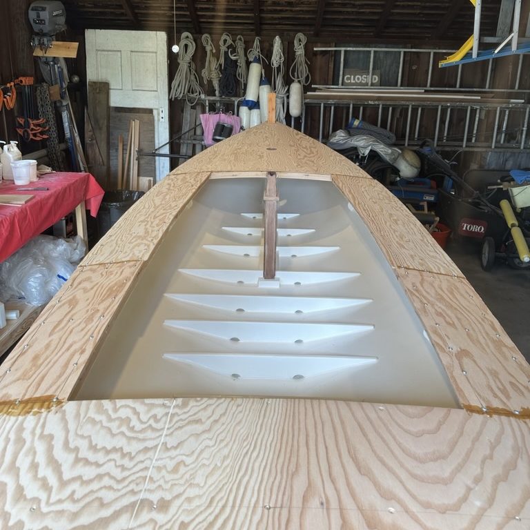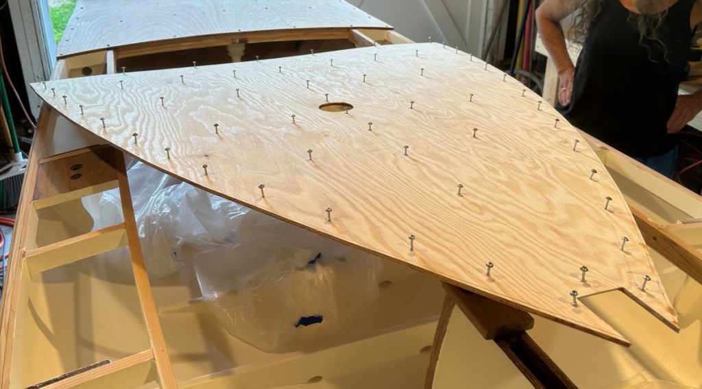 Working in sections, I pre-drilled the holes, set the screws in the ply, applied the glue, screwed in the decks, waited two hours or so for the epoxy to set, and removed the screws. It went quickly.