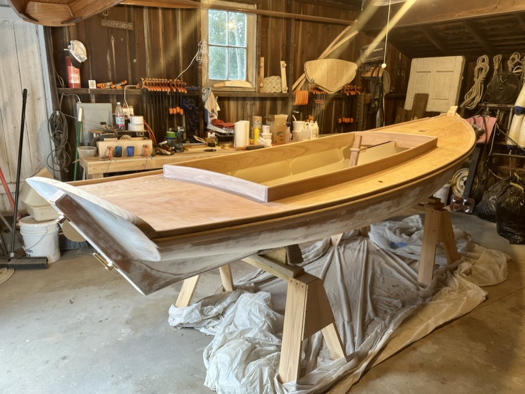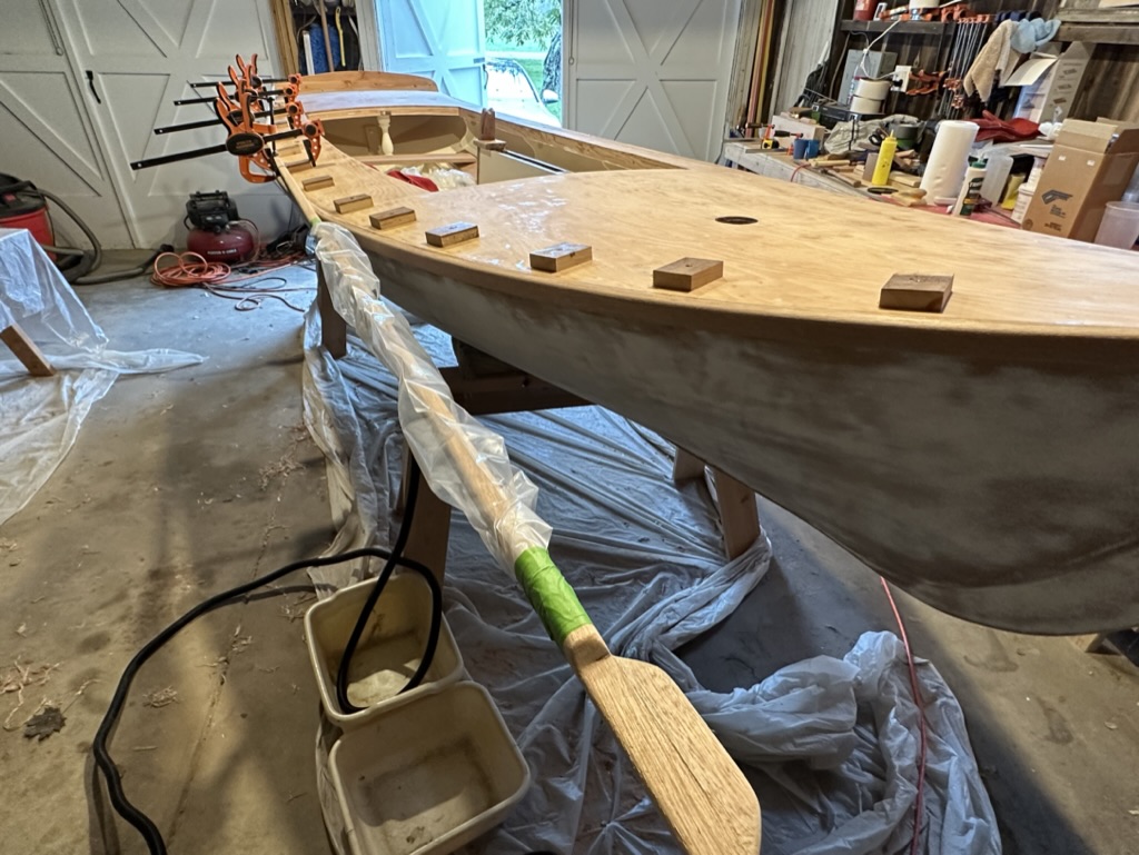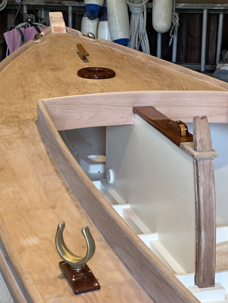 I was finished with the rub rails, toe rails, and coaming. After a quick look at temporarily placed details, it was time for some paint and varnish.