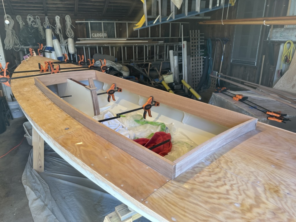 The mahogany coaming would come next. I made some crude templates to ensure that the curves right so they would follow the deck, then transferred them to 3/4″ mahogany, cut them out, and test fitted them. This took some time, working back and forth, as the end bevels were very shallow, and the coamings flared slightly outboard.