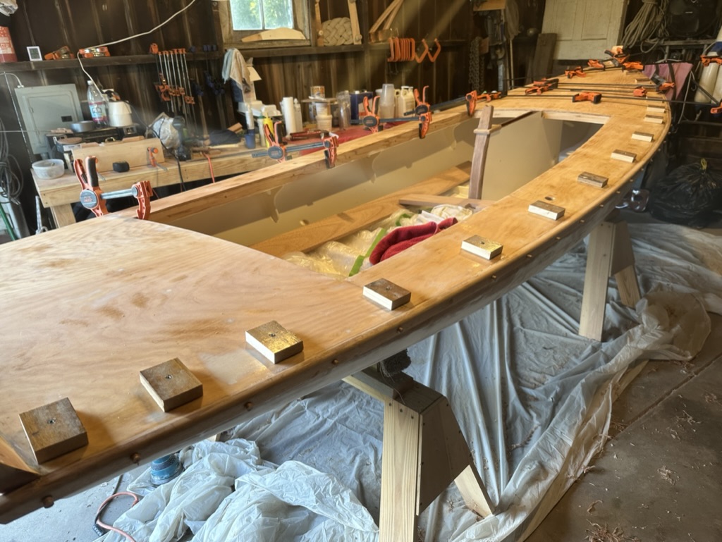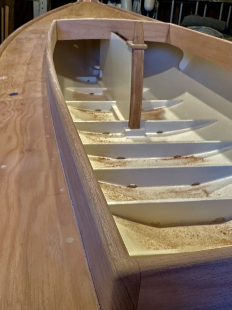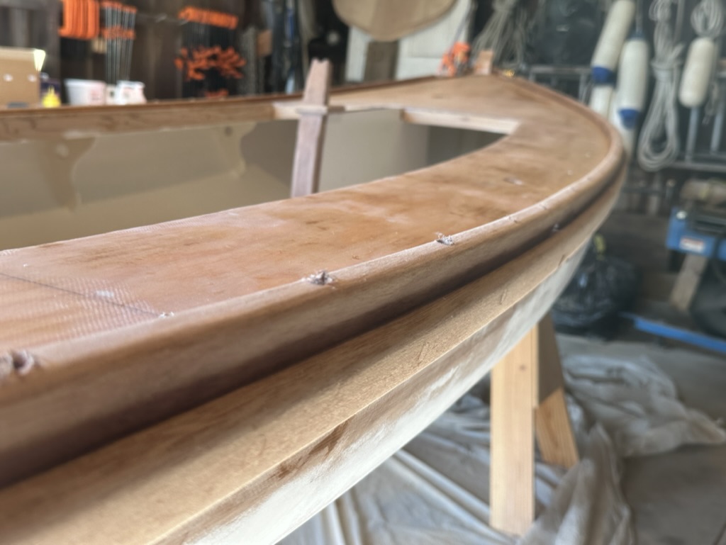 I had planned to just screw the rails to the hull so, if damaged, they could be removed easily. However, after I test screwed some sections, the fit proved very wavy and would not set fairly or tightly against the hull so I decided to use epoxy. I knew removing the rails would be a big chore in the future, but it was the only way to set them. I screwed them into a bed of epoxy and bunged the holes.