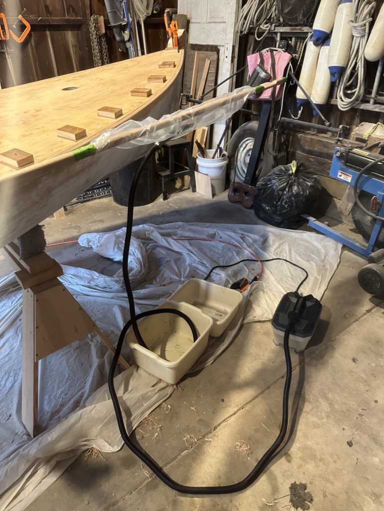 Following the specifications in the drawings, I made the rails 3/4″ x 1 1/2″ and rounded the edges. When test fitting the first rail on the boat, it was clear it would not bend at the bow section without breaking. Steaming was the only option. The rails were too long for a steam box, and I needed to steam only a four foot section, so I bought a small inexpensive wallpaper steamer and tubular bags.