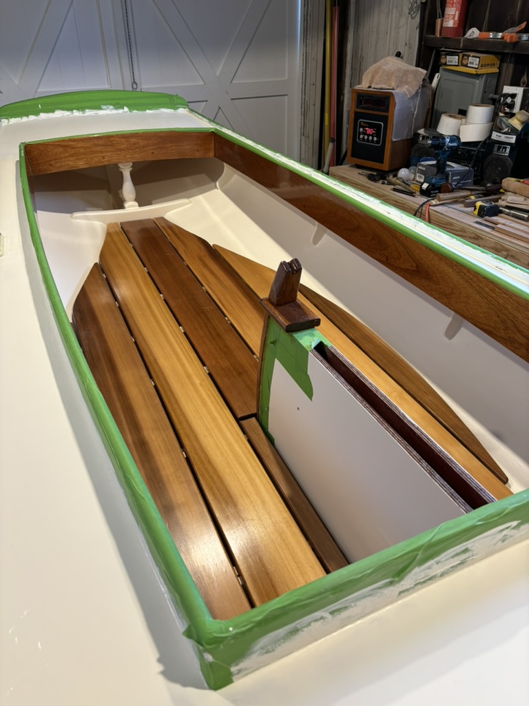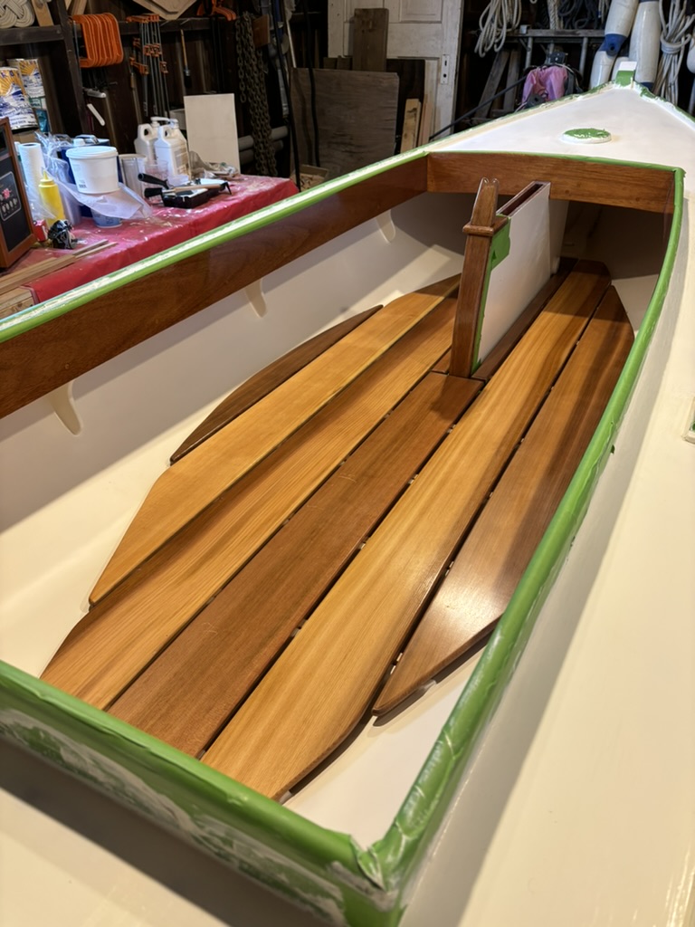The Tung oil enriched the varying colors of the cedar beautifully. When I finally stepped back and looked at them in the boat, I forgot all about my initial shock at the multi-colored array of cedar. I confidently planned to tell everyone that it was always my intention to find patterned cedar for the floorboards. And, that it was always my plan to enhance the difference with miracle Tung oil!
