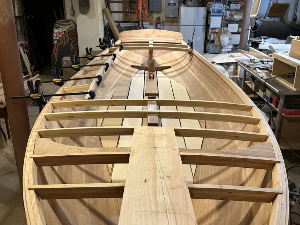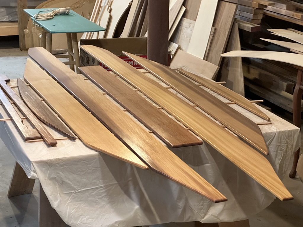 I decided to arrange them so the shifting patterns alternated with the adjoining planks. I convinced myself it would add some “flavor” to the bottom of the boat! I went ahead and cut them, rounded the edges, and then started the long process of applying Tung oil. I chose oil over a hard finish because I knew that, when they got dinged up, a hard finish would let in moisture, crack, and look horrible over time.
