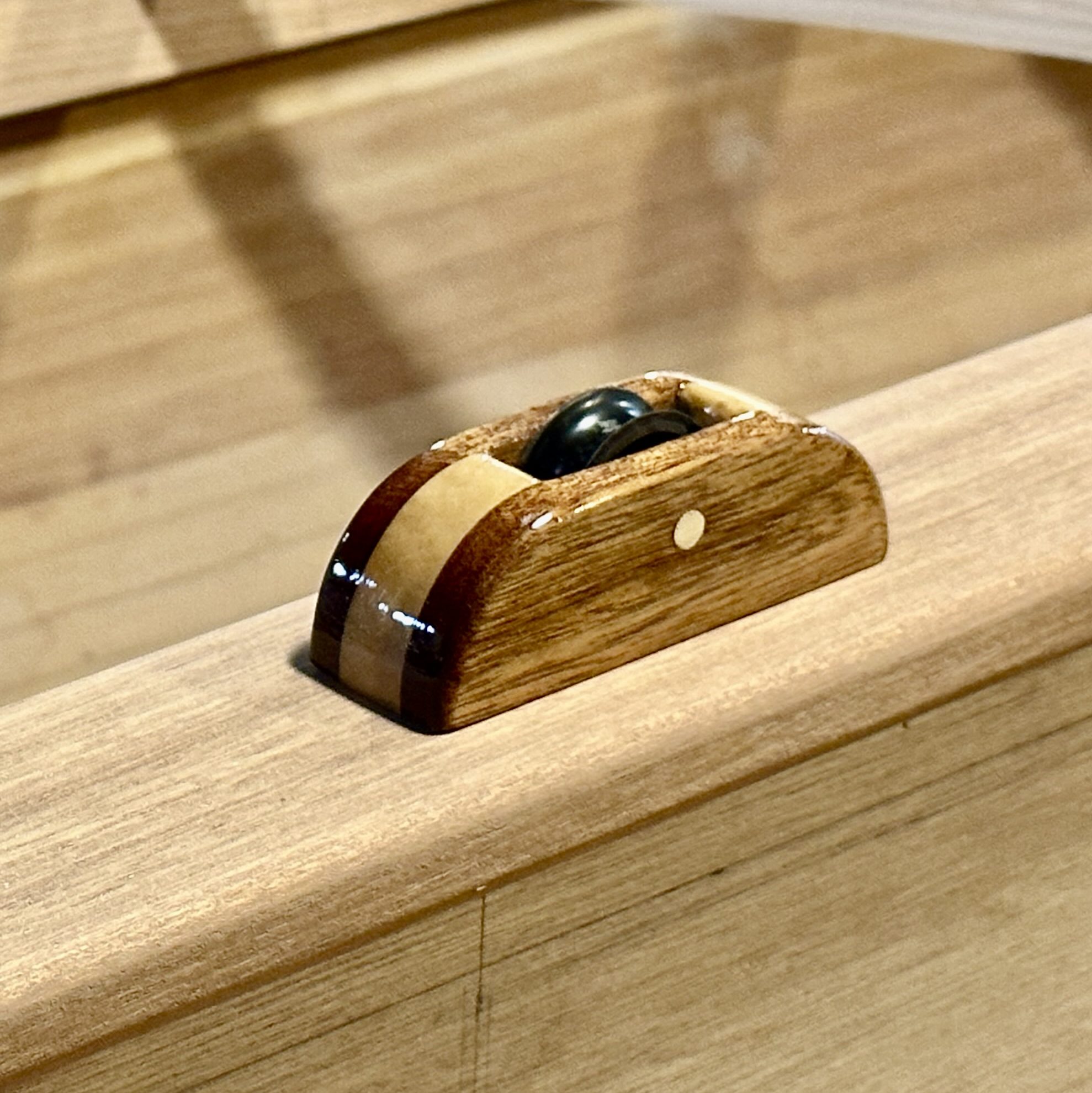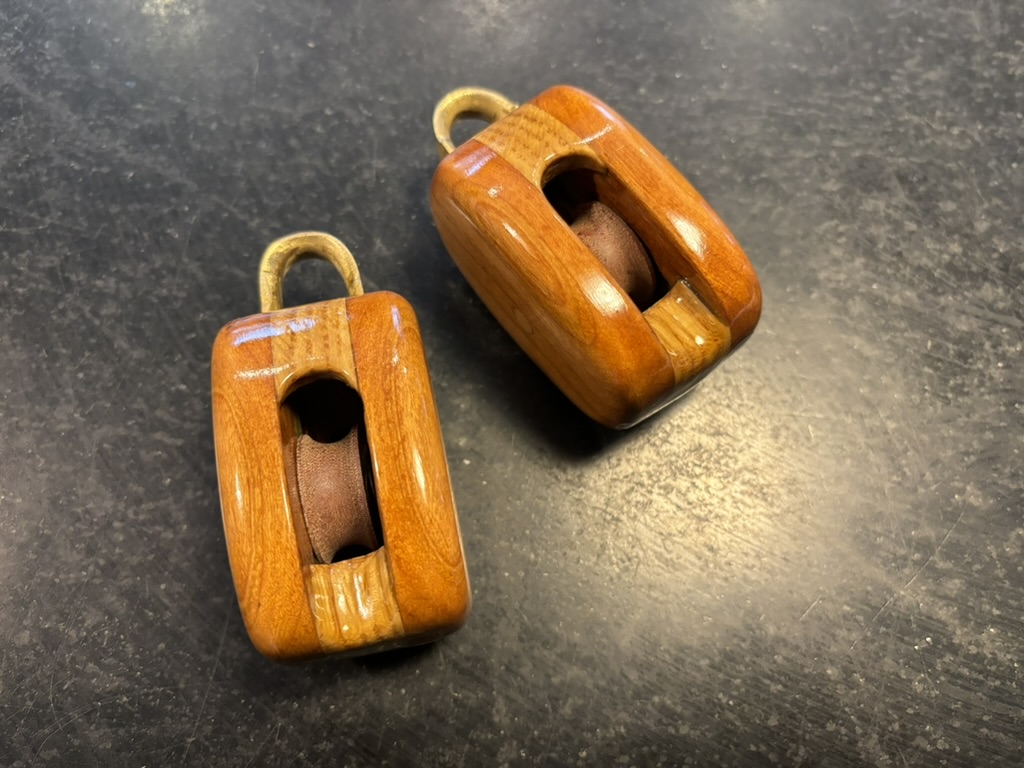Overall dimensions would be 2 1/2″ H x 1 1/2″ W x 1 1/2″ D. The cheeks are made of cherry and the spacers of white oak. I used 1/2″ half-oval bronze for the tangs and a 1/4″ bronze rod for the pivot. The sheave was 1″ x 1/2″ Tufnol. I dimensioned the blocks to accommodate up to 3/8″ rope.
