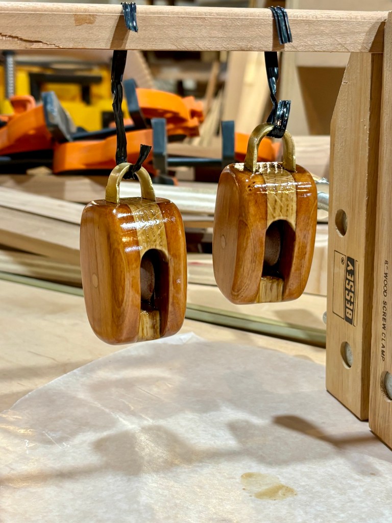 I sealed the inner faces of the wood with one coat of liquid epoxy and then put several coats of varnish on the inside. Then the pivot pin went in with the sheave and, as stoppers for the pin, I plugged the outer holes with oak dowels. Ten coats of vanish on the outside faces came last.