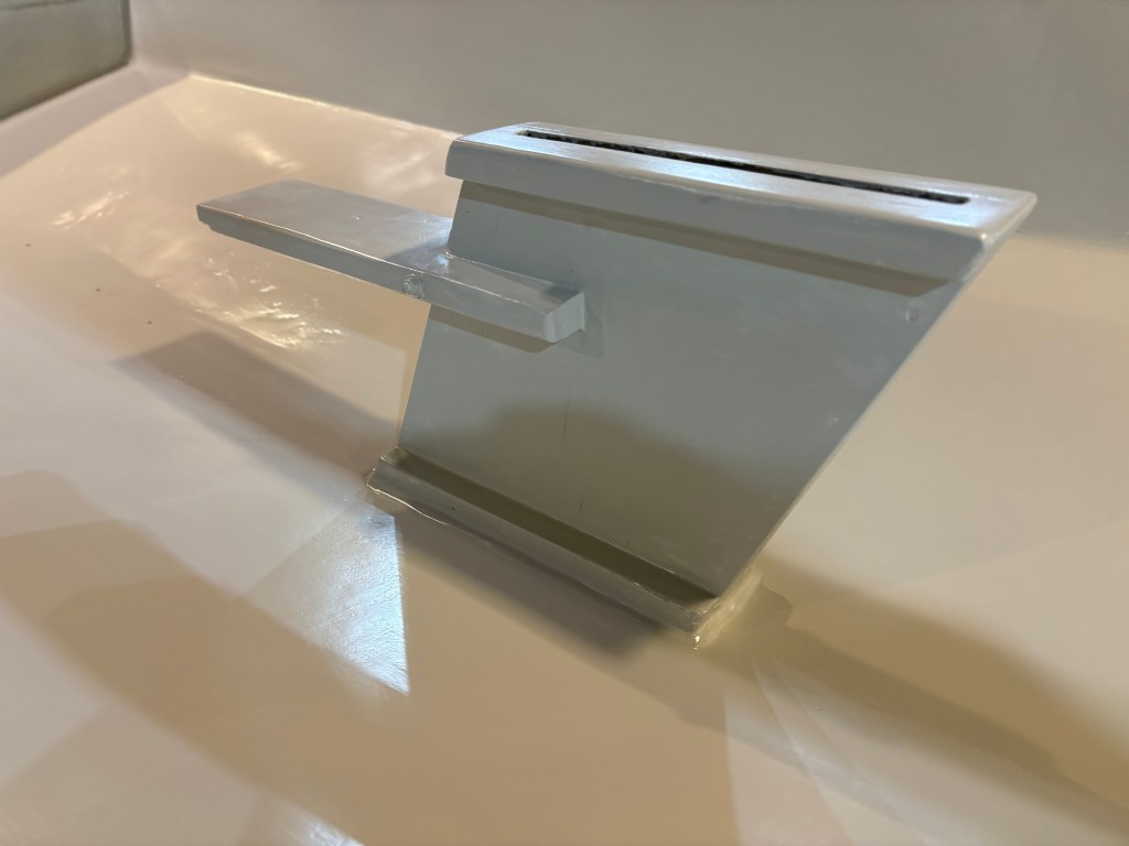 The next step was to prime it with Interlux Pre-Kote. After a first coat I sanded it well, almost removing the coat. The Pre-Kote works well to fill all the small indentations missed in the filler process. It just means that after sanding most of the first coat off, it is necessary to add more coats, sanding in between, to get all the imperfections filled completely. I ended up doing three coats.