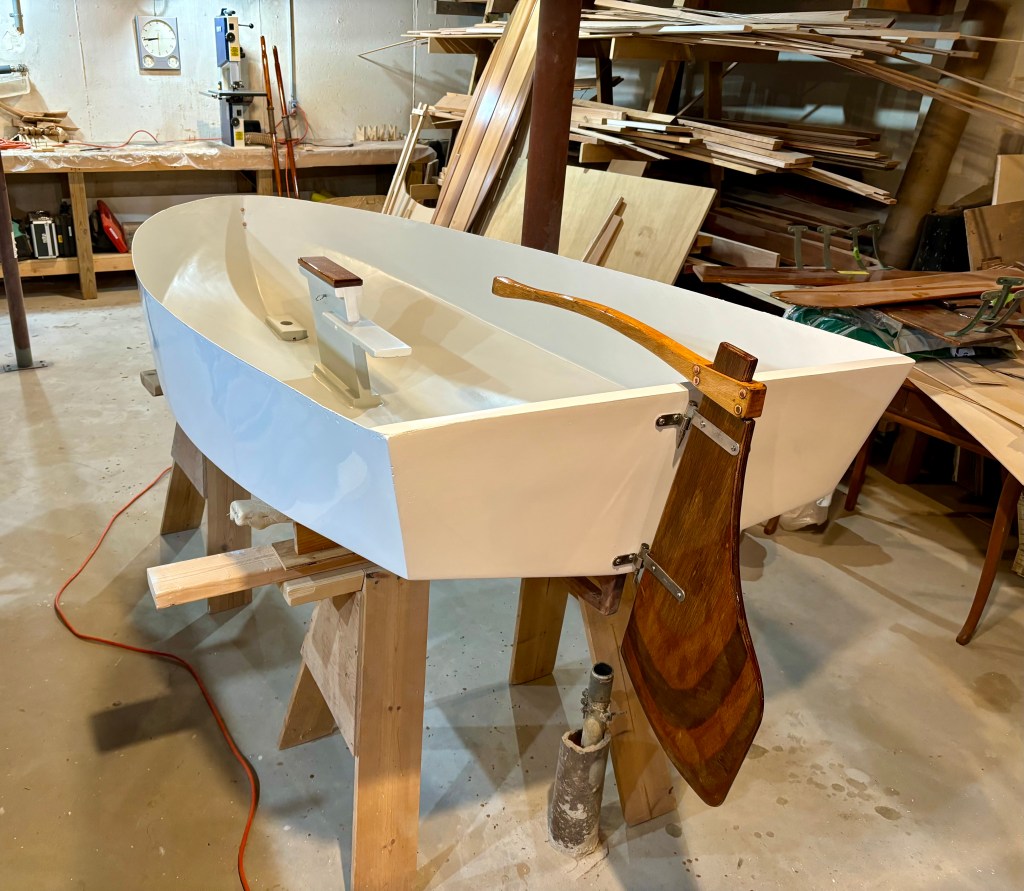 Then, rolling and tipping, I painted it with gloss white Interlux Brightside. It would take three coats to cover all the dark spots, sanding with 220-grit in between. As dinghies get a lot of abuse, three coats would also add some protection. Brightside levels very well. When dry there were no visible brush marks. It was remarkably smooth and very glossy. After the final coat it was a far cry from what it looked like when I used it so many years ago! Not perfect, but almost like new!