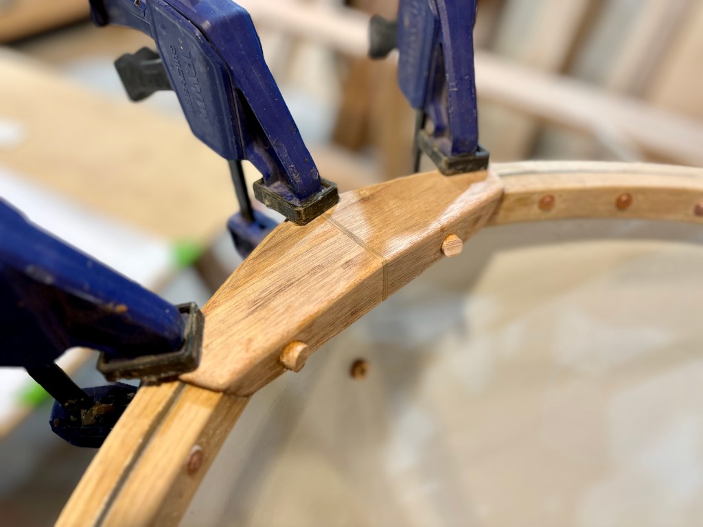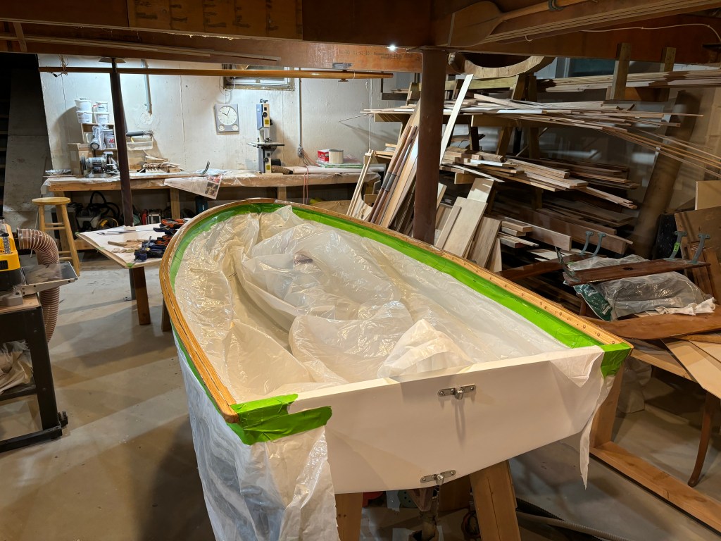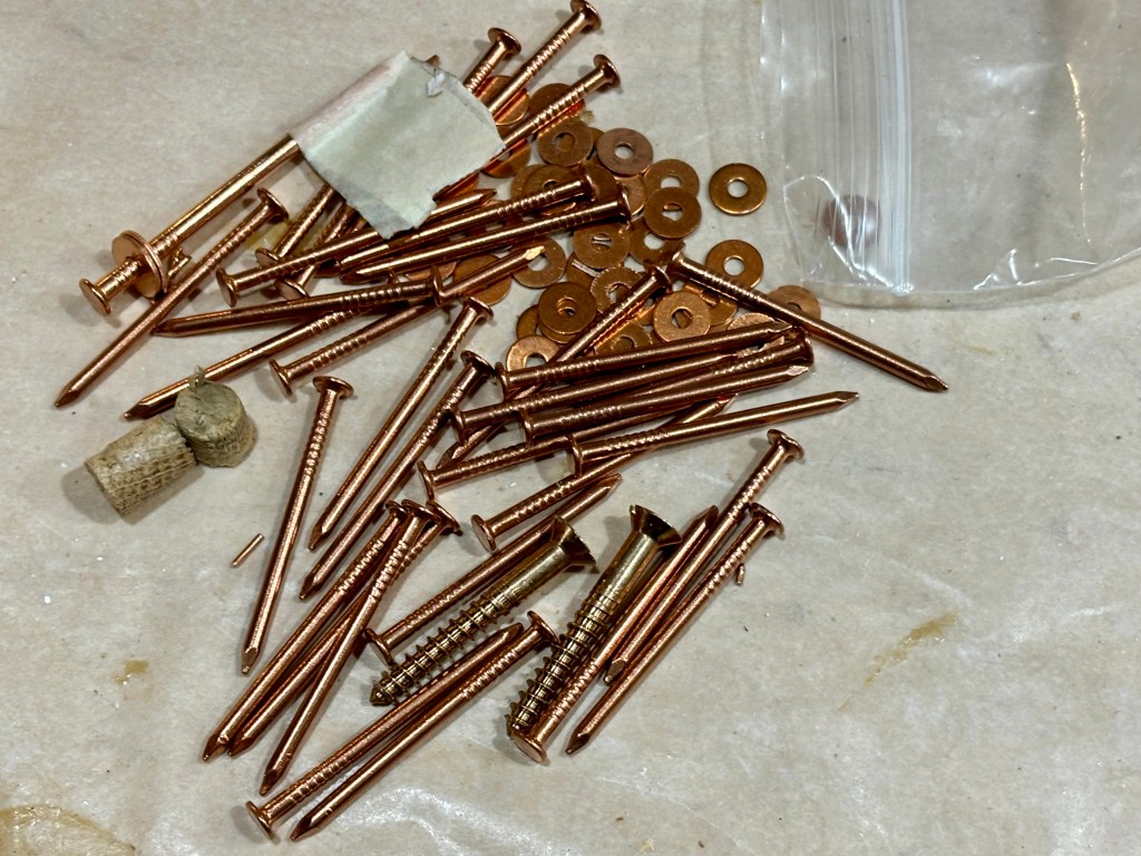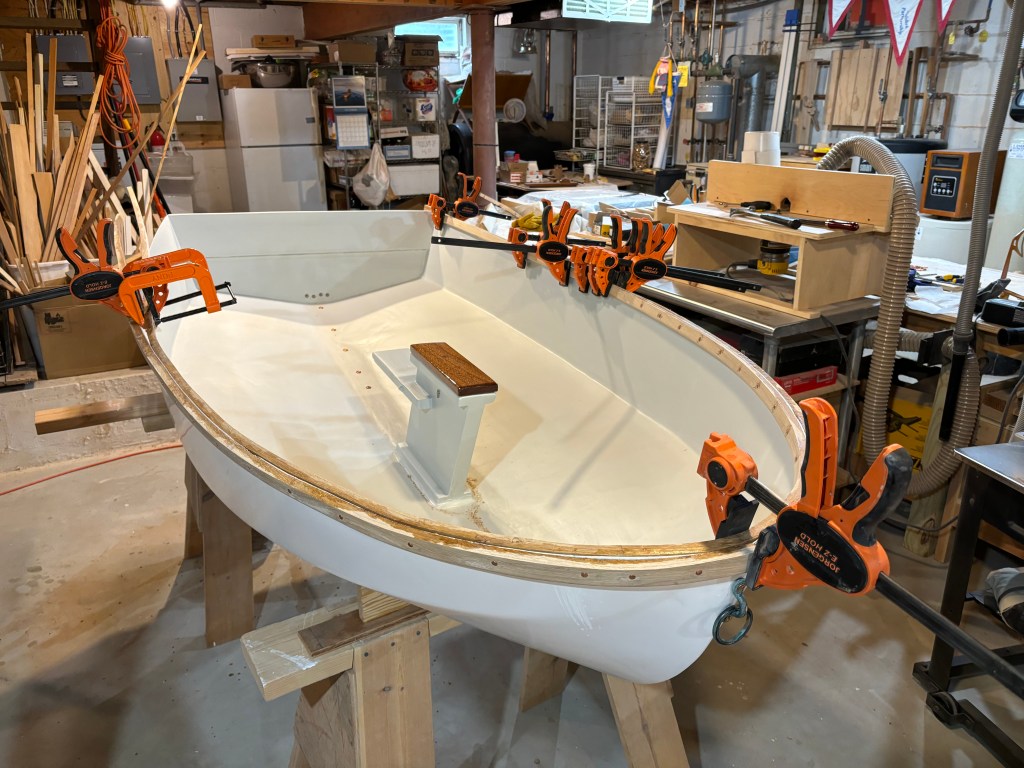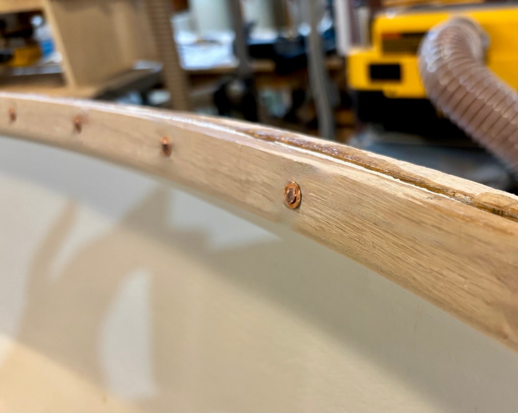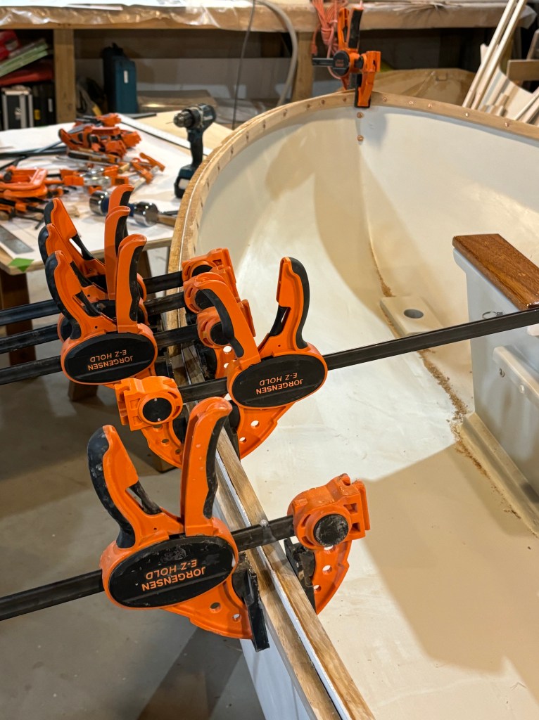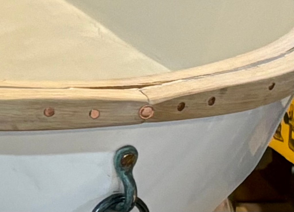 The rails came with copper rivets, roves and some screws. I varnished the inside surfaces to seal them. After the steam bending fixes it took some muscling to get them seated properly. However, once clamped and seated the riveting went rapidly. Rivets were placed every 4″ along the rails with 2″ spacing at the bow.