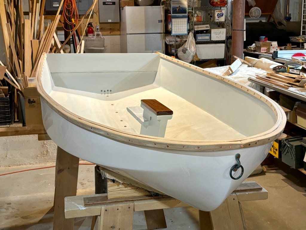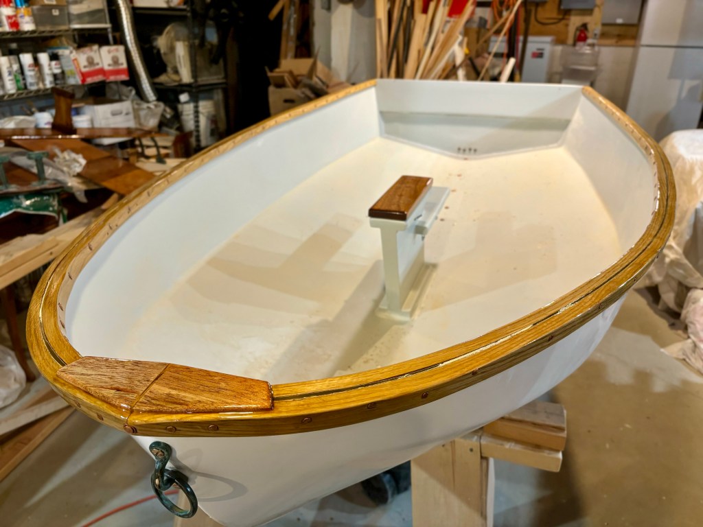 The old gunnels were extremely rotted so I ordered replacement oak clamp and rub rails from the Dinghy Shop. They were made by Anchorage in Rhode Island, the original and current maker of Dyers. After I received them (it took many months), I found them crudely steam bent. So, I had to do some remedial steam bending to get them to fit properly. Some previous owner had greatly altered the fiberglass shear line (ground down) at the bow in their attempt to fix the bow rub rail, so the new stock rails needed some alterations for a proper fit.
