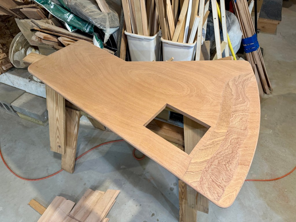 The centerboard and rudder were scaled from the drawings. Making the centerboard first would allow me to build the centerboard case around it to make sure of a tight fit. The arch of the trailing edge used the pivot hole location as the anchor point. It was well marked and will be drilled when the case is built to assure proper alignment. The rudder is less precise and has some “shapely flair” which is really just eye-balling a nice shape.