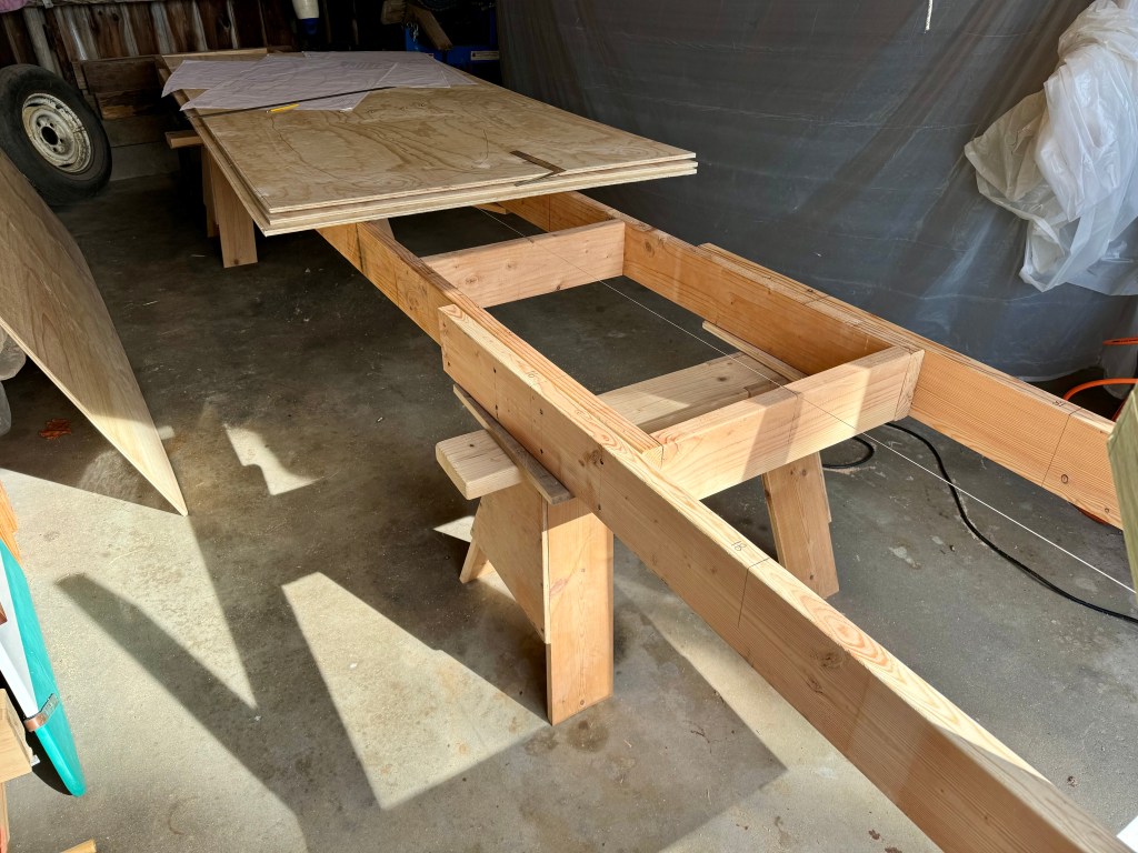 I reused an old strong back from my Seaford Skiff build and extended it to the full 17′ 6″. Doug called for 2 x 8 supports. The old one was made from 2 x 6s. I just went ahead with that and reinforced them along the length.