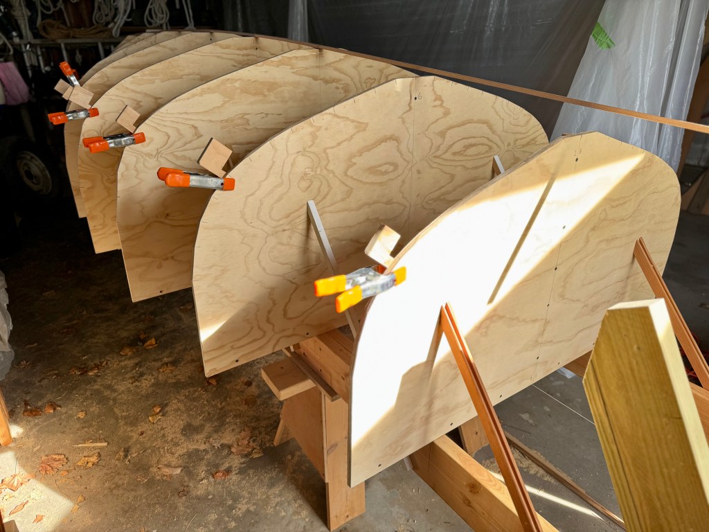 Then it was a simple matter to layout the molds according to the full scale profiles on the drawings. I used 1/2″ plywood with a support brace at the bottom. The drawings called for 3/4″ plywood molds. But, as cost was an issue, I used the 1/2″ and reinforced the centers to assure flatness. I used scrap to brace each mold. It is plenty stiff.