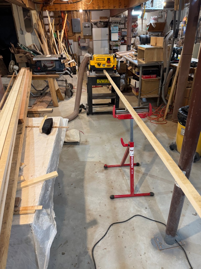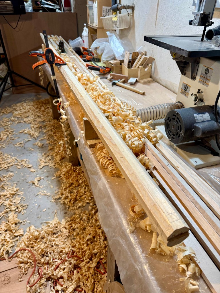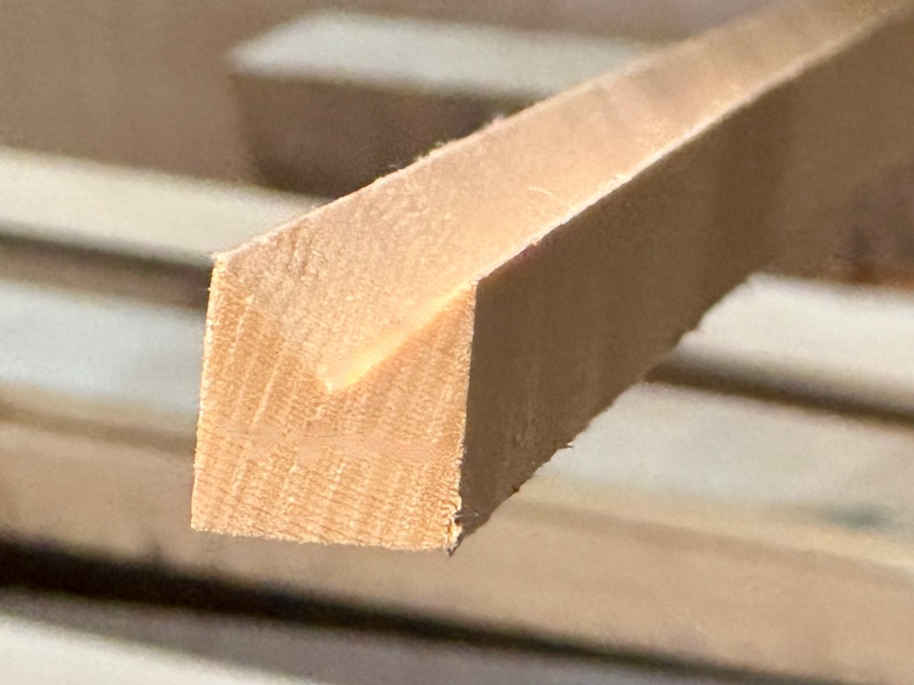 The first step was planing down the Sitka to surface it. Then I focused on the birds mouth main mast. After calculating the dimensions needed for the eight sides I ripped the lumber into 3/4″ thk. strips. Then tapered them according to Doug’s offsets on the table saw, hand planed them to the designed profile and cut a 45 degree “V” on one side (to seat with the 90 degree corner of the adjacent strip, making up an octagon). In order to get a clean and accurate V cut I rigged up a few feather boards to guide the wood accurately.