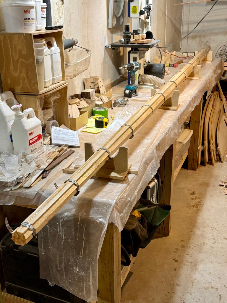 After dry assembly to test the fit (which turned out to be very good) I then wet the edges down with epoxy and added epoxy with filler. Assembling them is always a slurry mess, but got them together with the help of some tape. Then hose clamps went on, tightened, and the squeezed out epoxy was removed to help with cleanup. I slightly adjusted the length of the mast staves to assure it was straight.