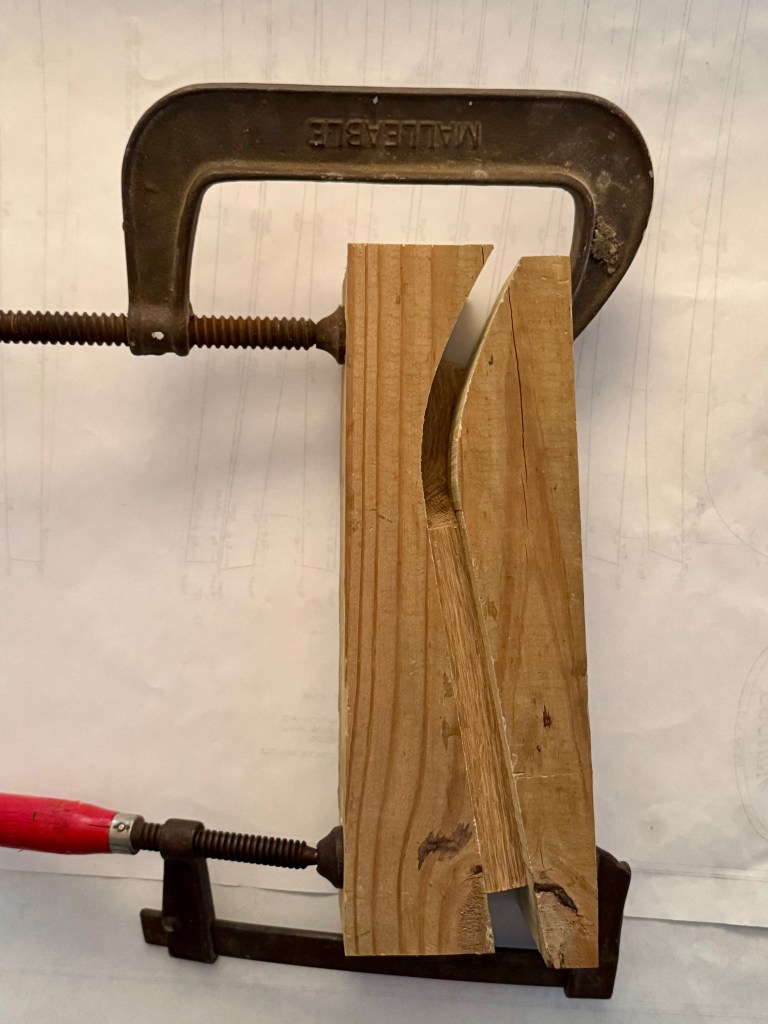 The gaff and boom jaws are made of white oak. The gaff jaws were steam bent to achieve their curvature. I made a mold of the shape with compensation for spring back from a thick piece of fir. Seems to have worked out well as the curvature aligns with Doug’s full scale drawings. The mold would only accommodate one half jaw at a time. Next time I will build one to handle at least two at a time. While the steaming did not take long I had to wait 24 hours for it to cool and dry. Eight days for four jaws was not an efficient use of time.
