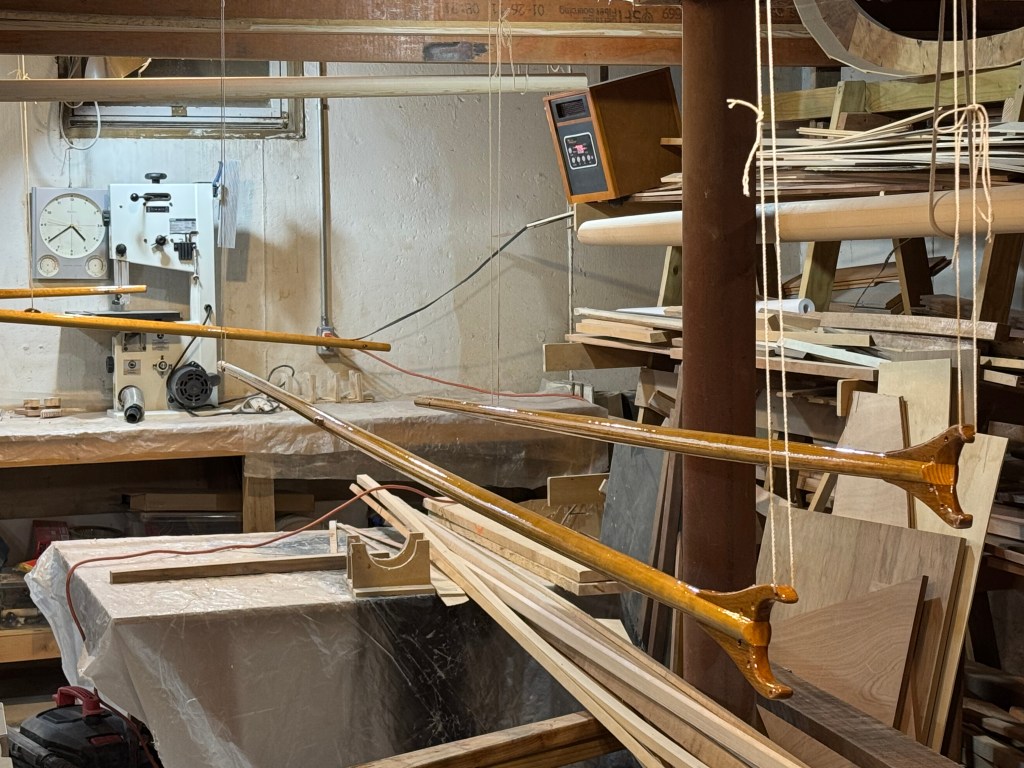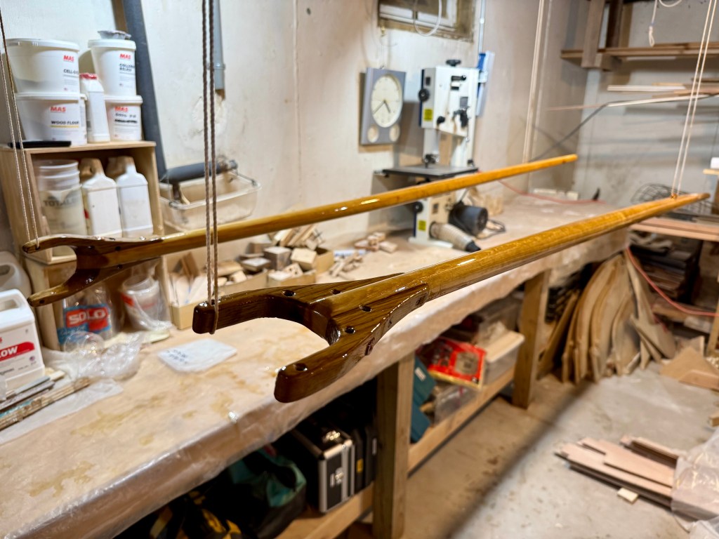 The booms and gaffs were remarkably thin so I made them from a single length of Sitka. There was a bit of warpage on the smaller gaffs, but Sitka is so bendy it should be fine. They were all tapered according to Doug’s drawings. I hope the Sitka Spruce lives up to it’s strength reputation because they are VERY thin at their ends.
