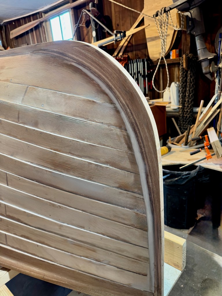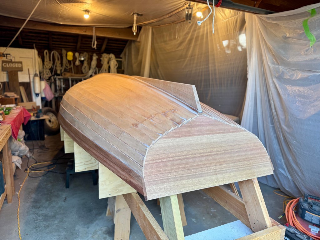 The false stem was screwed (bronze) and epoxied to the inner stem and scarfed to the forward end of the outer keel. It fit nicely as it had been laminated over the inner keel. Then it was trimmed down to the final stem profile.
