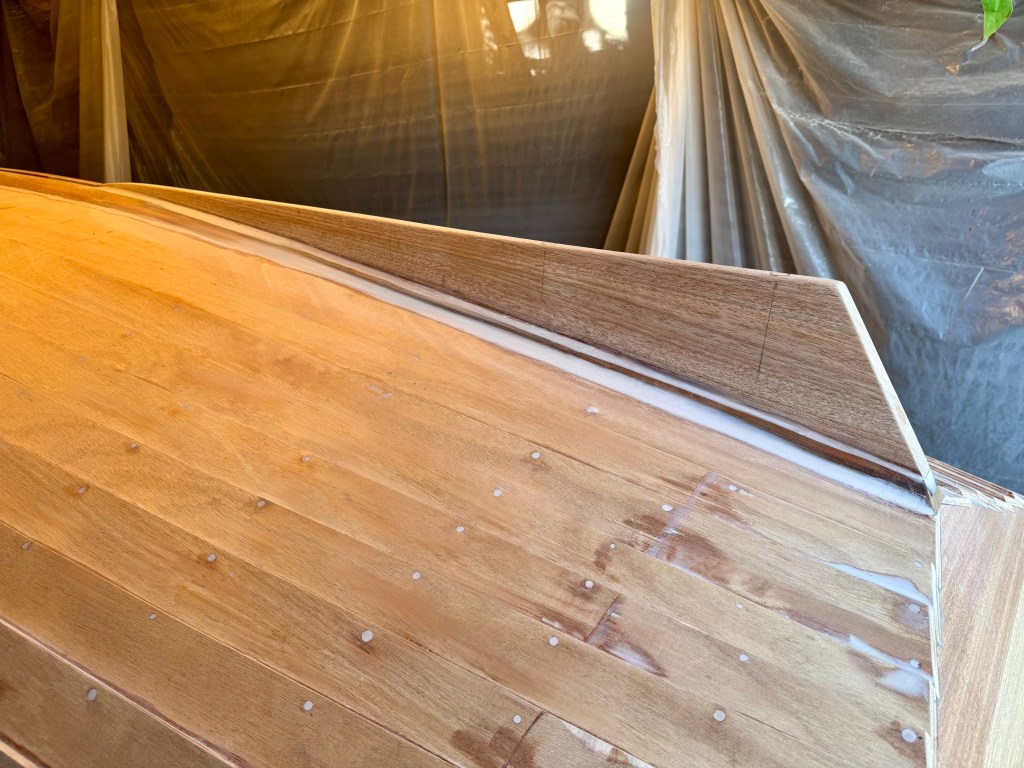 The skeg is 3/4″ solid mahogany. I made a template of the keel curvature to cut the keel attachment edge. It was screwed, through bolted (bronze) and epoxied to the outer keel.