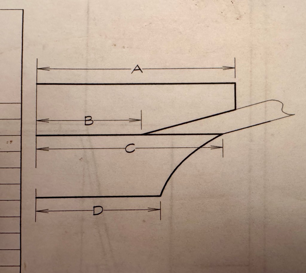 Before installing the keel I tapered the edges according to the drawings from vertical at the bow to about 45 degrees at the skeg end. This rolling bevel would eventually be cut concave with a scraper and sand paper. It was a particular Herreshoff detail.