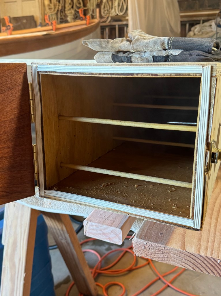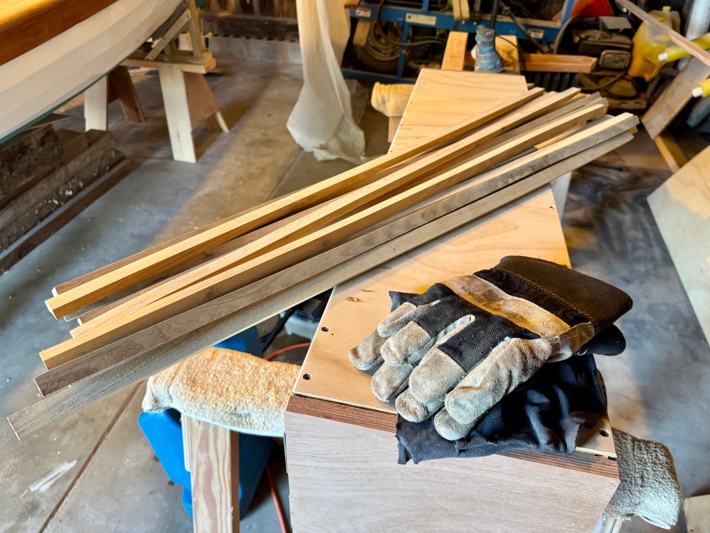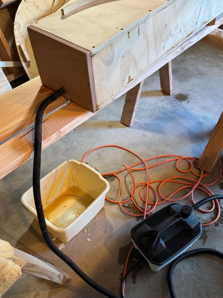 After milling the locust frames they needed to be steam bent to follow the curve of the hull. I built a steam box from scrap 3/4″ plywood. It was sized to accommodate 48″ stock. I built the volume a little big thinking I might need it for other larger tasks. Mistake. Keeping the volume of the box small helps to accelerate the steaming process. As it turned out, the time it took to steam the 1/2″ x 3/4″ locust (48″ long) was far too long. It exhausted the water in the tank too quickly. I had to fill it occasionally while steaming. This caused the water in the tank to cool which took much more time than it should. Lesson learned.