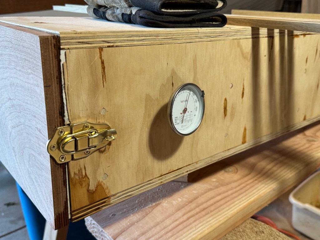 A meat thermometer and clamp latch. Box was tilted to allow condensed water to drain from a small hole at the bottom. A small 1/4″ vent hole was drilled at the top near the door to allow excess steam to escape.