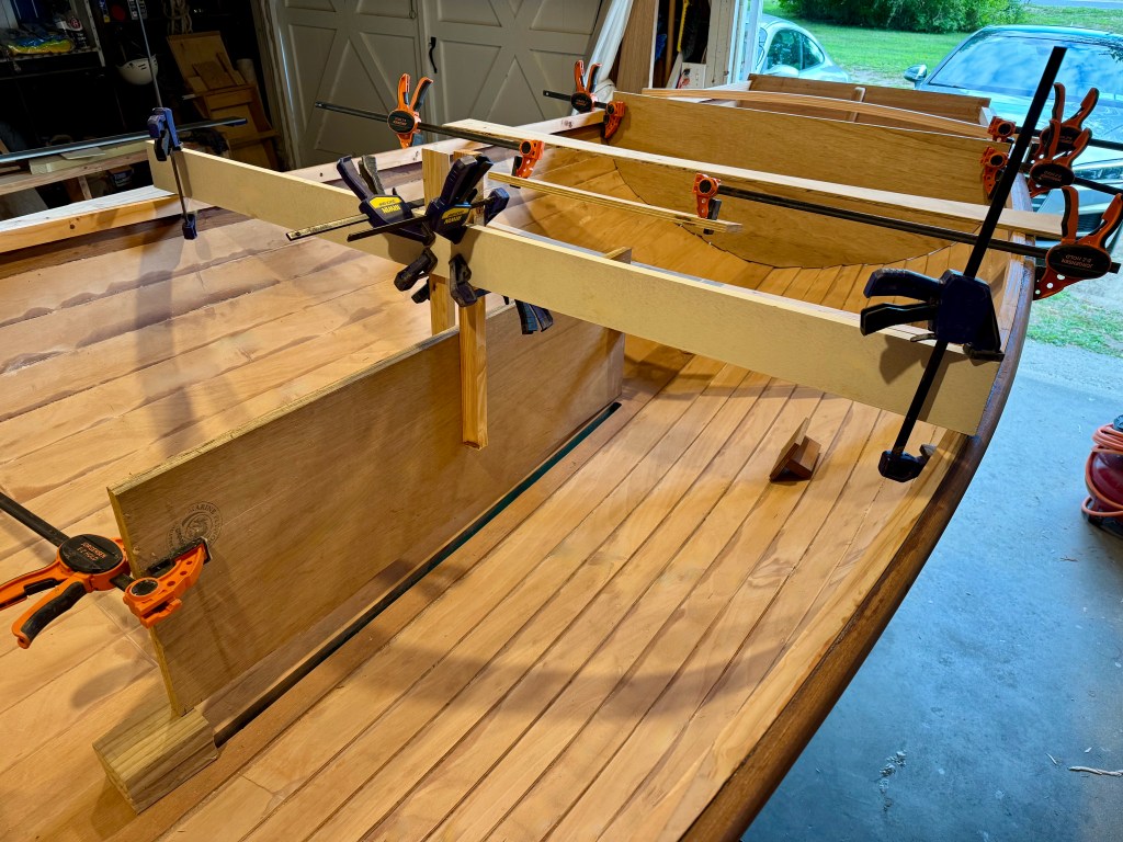 The sides of the trunk are 1/2″ Mahogany plywood and the end caps are solid mahogany. The two sides were cut to length, matched, leveled and placed into the boat to scribe the curve of the keel.