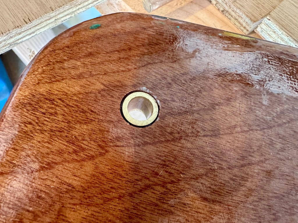Holes for a 3/8″ solid bronze pin were drilled in two positions. One for board all the way up, and one for half raised. A line and grab handle block were attached to the board to stop the board in the fully down position. After varnishing bronze half ovals will be put under the pin on the cover to protect it.