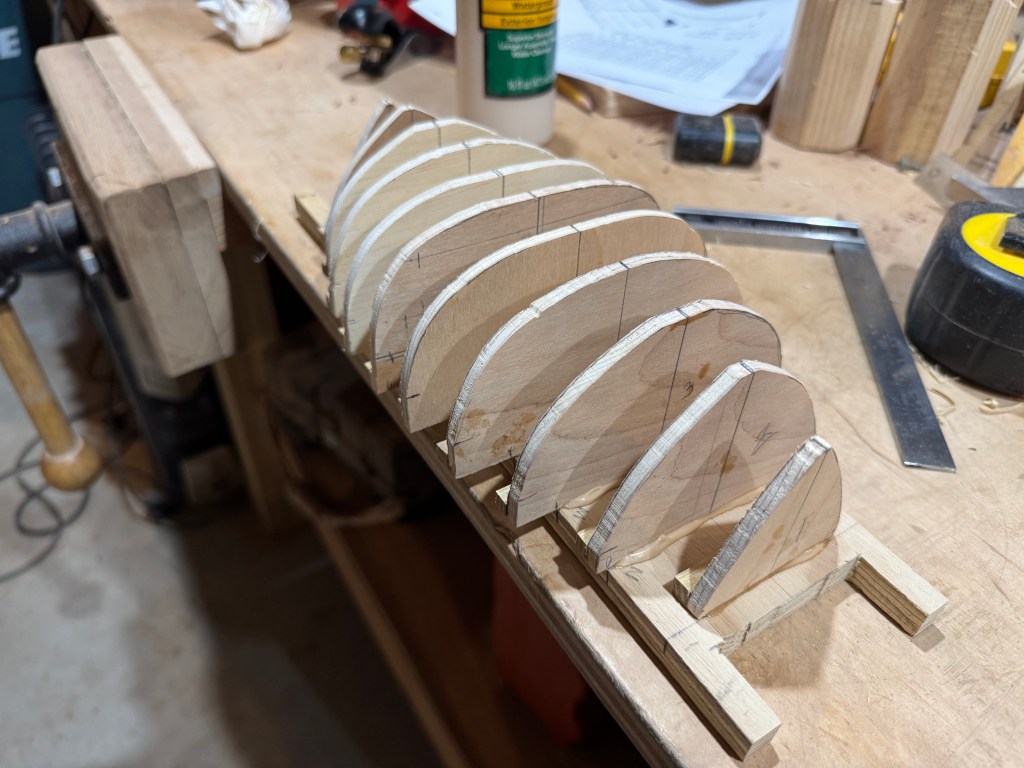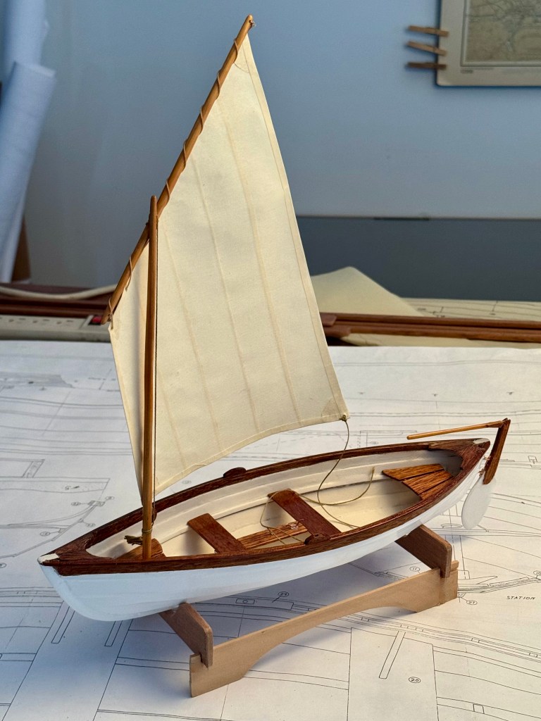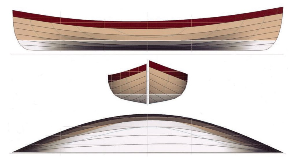 As the cold continues and work in the outside shop is restricted I have started thinking about the next boat. Since the Coquina has taken far longer than I anticipated I looked for something simpler, classic, smaller, and in short – a quicker build. I have always wanted a peapod. They row exceptionally well, are beautiful, and quick to build. So, I have been researching Peapod designs. While they are all quite similar there are subtle differences that make a great impact. Mostly in the shear line, the bottom contour, and construction details. Wooden Boat had a great article, A Gallery of Peapod Lines, comparing different designs that rated the aspects of many of the classic working and recreational peapods. All the lines are from boats from the late 19th to early 20th century when peapods were a common sight in Maine. Many are lapstrake but some are traditionally built plank on frame. As the cold continues I went down into the heated shop and built a model of one I thought might be right for how I intend to use it. I wanted good stability, moderate shear line rake, symmetry fore and aft, moderate freeboard, ability to sail well, and light weight. For speed of build I went for glued lapstrake on the model. I am considering cedar strip build for the big one, but for the model I went with lapstrake. The hull shape is modeled after the Matinincus Peapod.