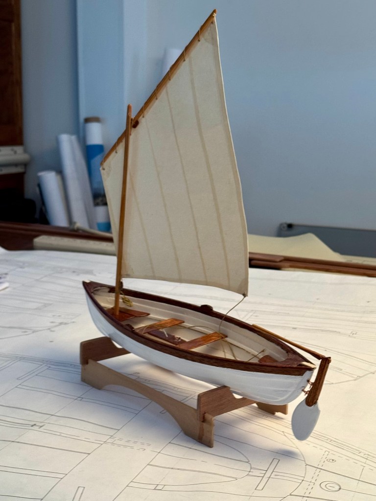 After cutting the molds and setting up the strong back it was quick work. It took about two days. I made a simple lug rigged sail with paper and masking tape.